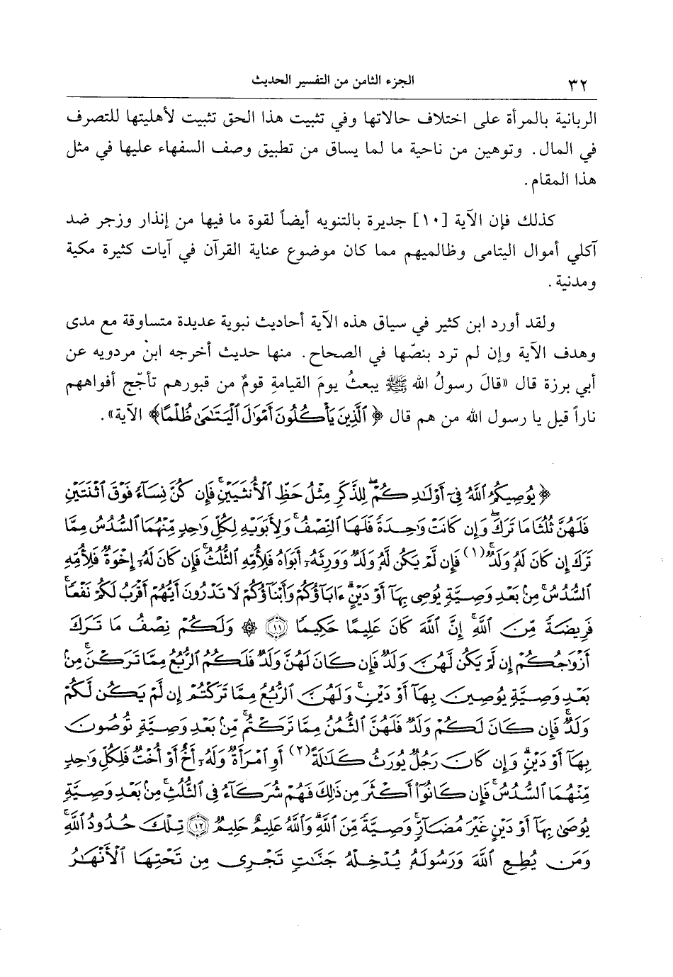 كذلك فإن الآية [10] جديرة بالتنويه أيضا لقوة ما فيها من إنذار وزجر ضد آكلي أموال اليتامى وظالميهم مما كان موضوع عناية القرآن في آيات كثيرة مكية ومدنية.