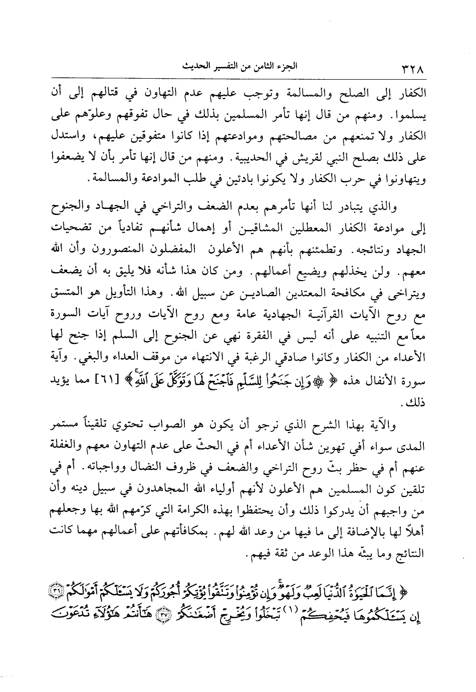 الكفار إلى الصلح والمسالمة وتوجب عليهم عدم التهاون في قتالهم إلى أن يسلموا. ومنهم من قال إنها تأمر المسلمين بذلك في حال تفوقهم وعلوّهم على الكفار ولا تمنعهم من مصالحتهم وموادعتهم إذا كانوا متفوقين عليهم، واستدل على ذلك بصلح النبي لقريش في الحديبية. ومنهم من قال إنها تأمر بأن لا يضعفوا ويتهاونوا في حرب الكفار ولا يكونوا بادئين في طلب الموادعة والمسالمة.