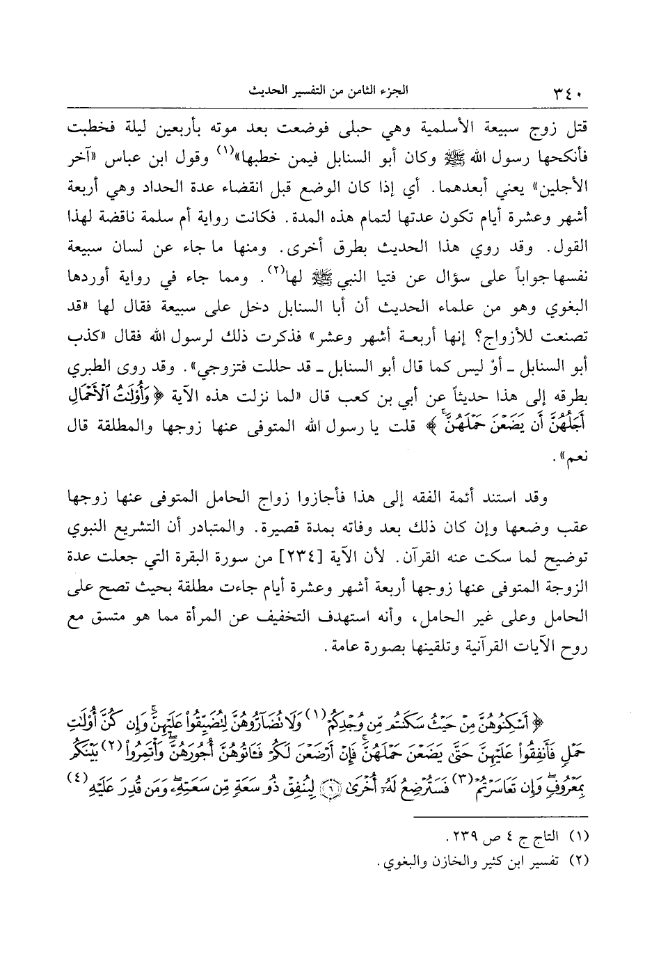 قتل زوج سبيعة الأسلمية وهي حبلى فوضعت بعد موته بأربعين ليلة فخطبت فأنكحها رسول الله صلى الله عليه وسلم وكان أبو السنابل فيمن خطبها» «1» وقول ابن عباس «آخر الأجلين» يعني أبعدهما. أي إذا كان الوضع قبل انقضاء عدة الحداد وهي أربعة أشهر وعشرة أيام تكون عدتها لتمام هذه المدة. فكانت رواية أم سلمة ناقضة لهذا القول. وقد روي هذا الحديث بطرق أخرى. ومنها ما جاء عن لسان سبيعة نفسها جوابا على سؤال عن فتيا النبي صلى الله عليه وسلم لها «2» . ومما جاء في رواية أوردها البغوي وهو من علماء الحديث أن أبا السنابل دخل على سبيعة فقال لها «قد تصنعت للأزواج؟ إنها أربعة أشهر وعشر» فذكرت ذلك لرسول الله فقال «كذب أبو السنابل- أو ليس كما قال أبو السنابل- قد حللت فتزوجي» . وقد روى الطبري بطرقه إلى هذا حديثا عن أبي بن كعب قال «لما نزلت هذه الآية وَأُولاتُ الْأَحْمالِ أَجَلُهُنَّ أَنْ يَضَعْنَ حَمْلَهُنَّ قلت يا رسول الله المتوفى عنها زوجها والمطلقة قال نعم» .