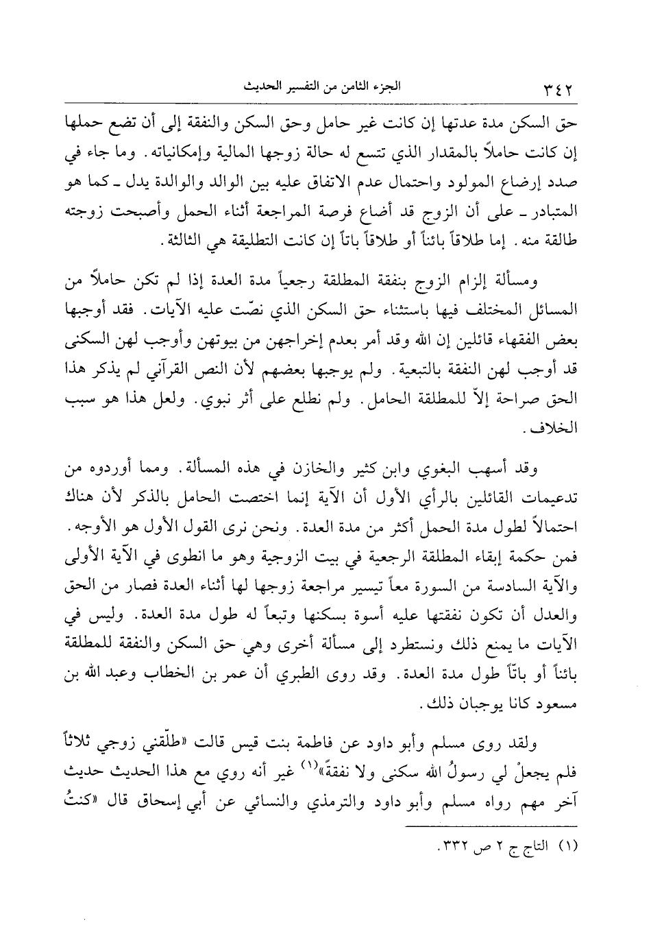 وقد أسهب البغوي وابن كثير والخازن في هذه المسألة. ومما أوردوه من تدعيمات القائلين بالرأي الأول أن الآية إنما اختصت الحامل بالذكر لأن هناك احتمالا لطول مدة الحمل أكثر من مدة العدة. ونحن نرى القول الأول هو الأوجه.