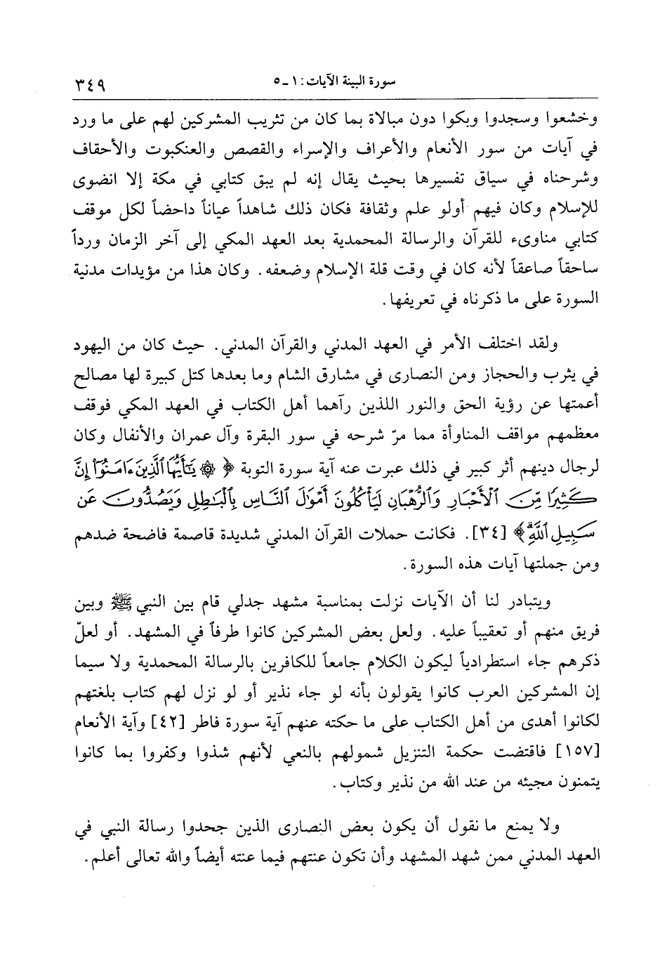 ولقد اختلف الأمر في العهد المدني والقرآن المدني. حيث كان من اليهود في يثرب والحجاز ومن النصارى في مشارق الشام وما بعدها كتل كبيرة لها مصالح أعمتها عن رؤية الحق والنور اللذين رآهما أهل الكتاب في العهد المكي فوقف معظمهم مواقف المناوأة مما مرّ شرحه في سور البقرة وآل عمران والأنفال وكان لرجال دينهم أثر كبير في ذلك عبرت عنه آية سورة التوبة يا أَيُّهَا الَّذِينَ آمَنُوا إِنَّ كَثِيراً مِنَ الْأَحْبارِ وَالرُّهْبانِ لَيَأْكُلُونَ أَمْوالَ النَّاسِ بِالْباطِلِ وَيَصُدُّونَ عَنْ سَبِيلِ اللَّهِ [34] . فكانت حملات القرآن المدني شديدة قاصمة فاضحة ضدهم ومن جملتها آيات هذه السورة.