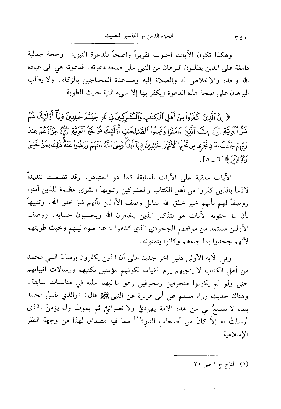 . الآيات معقبة على الآيات السابقة كما هو المتبادر. وقد تضمنت تنديدا لاذعا بالذين كفروا من أهل الكتاب والمشركين وتنويها وبشرى عظيمة للذين آمنوا ووصفا لهم بأنهم خير خلق الله مقابل وصف الأولين بأنهم شرّ خلق الله. وتنبيها بأن ما احتوته الآيات هو لتذكير الذين يخافون الله ويحسبون حسابه. ووصف الأولين مستمد من موقفهم الجحودي الذي كشفوا به عن سوء نيتهم وخبث طويتهم لأنهم جحدوا بما جاءهم وكانوا يتمنونه.