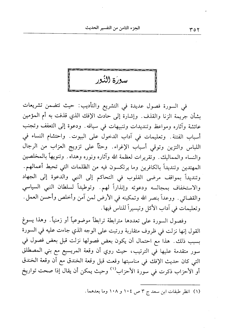 وفصول السورة على تعددها مترابطة ترابطا موضوعيا أو زمنيا. وهذا يسوغ القول إنها نزلت في ظروف متقاربة ورتبت على الوجه الذي جاءت عليه في السورة بسبب ذلك. هذا مع احتمال أن يكون بعض فصولها نزلت قبل بعض فصول في سور متقدمة عليها في الترتيب، حيث روي أن وقعة المريسيع مع بني المصطلق التي كان حديث الإفك في مناسبتها وقعت قبل وقعة الخندق مع أن وقعة الخندق أو الأحزاب ذكرت في سورة الأحزاب «1» وحيث يمكن أن يقال إذا صحت تواريخ