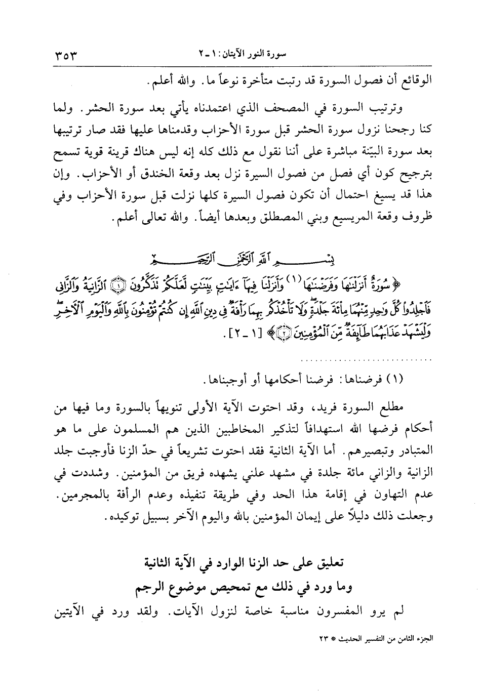 سُورَةٌ أَنْزَلْناها وَفَرَضْناها وَأَنْزَلْنا فِيها آياتٍ بَيِّناتٍ لَعَلَّكُمْ تَذَكَّرُونَ (1) الزَّانِيَةُ وَالزَّانِي فَاجْلِدُوا كُلَّ واحِدٍ مِنْهُما مِائَةَ جَلْدَةٍ وَلا تَأْخُذْكُمْ بِهِما رَأْفَةٌ فِي دِينِ اللَّهِ إِنْ كُنْتُمْ تُؤْمِنُونَ بِاللَّهِ وَالْيَوْمِ الْآخِرِ وَلْيَشْهَدْ عَذابَهُما طائِفَةٌ مِنَ الْمُؤْمِنِينَ (2)