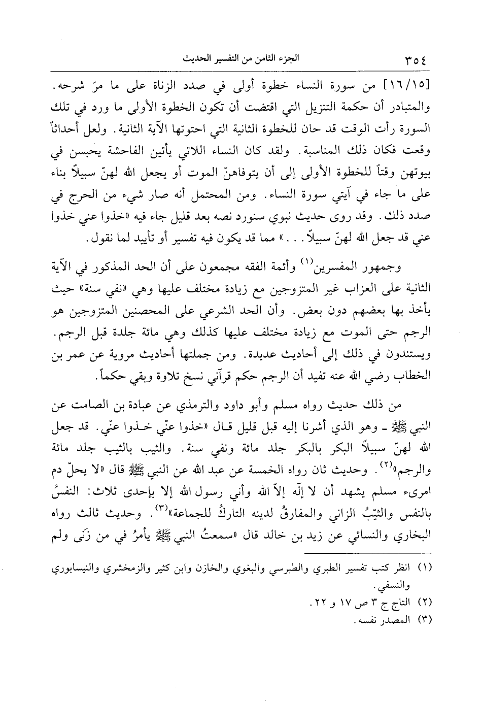 من ذلك حديث رواه مسلم وأبو داود والترمذي عن عبادة بن الصامت عن النبي صلى الله عليه وسلم- وهو الذي أشرنا إليه قبل قليل قال «خذوا عنّي. قد جعل الله لهنّ سبيلا البكر بالبكر جلد مائة ونفي سنة. والثيب بالثيب جلد مائة والرجم» «2» . وحديث ثان رواه الخمسة عن عبد الله عن النبي صلى الله عليه وسلم قال «لا يحلّ دم امرئ مسلم يشهد أن لا إله إلّا الله وأني رسول الله إلا بإحدى ثلاث: النفس بالنفس والثيّب الزاني والمفارق لدينه التارك للجماعة» «3» . وحديث ثالث رواه البخاري والنسائي عن زيد بن خالد قال «سمعت النبي صلى الله عليه وسلم يأمر في من زنى ولم