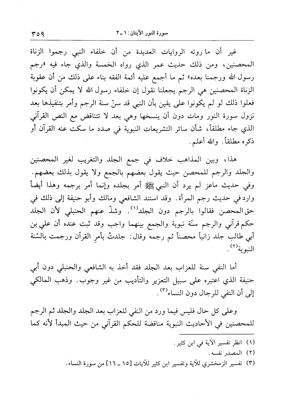غير أن ما روته الروايات العديدة من أن خلفاء النبي رجموا الزناة المحصنين، ومن ذلك حديث عمر الذي رواه الخمسة والذي جاء فيه «رجم رسول الله ورجمنا بعده» ثم ما أجمع عليه أئمة الفقه بناء على ذلك من أن عقوبة الزناة المحصنين هي الرجم يجعلنا نقول إن خلفاء رسول الله لا يمكن أن يكونوا فعلوا ذلك لو لم يكونوا على يقين بأن النبي قد سنّ سنة الرجم وأمر بتنفيذها بعد نزول سورة النور ومات دون أن ينسخها وهي بعد لا تتناقض مع النص القرآني الذي جاء مطلقا، شأن سائر التشريعات النبوية في صدد ما سكت عنه القرآن أو ذكره مطلقا. والله أعلم.