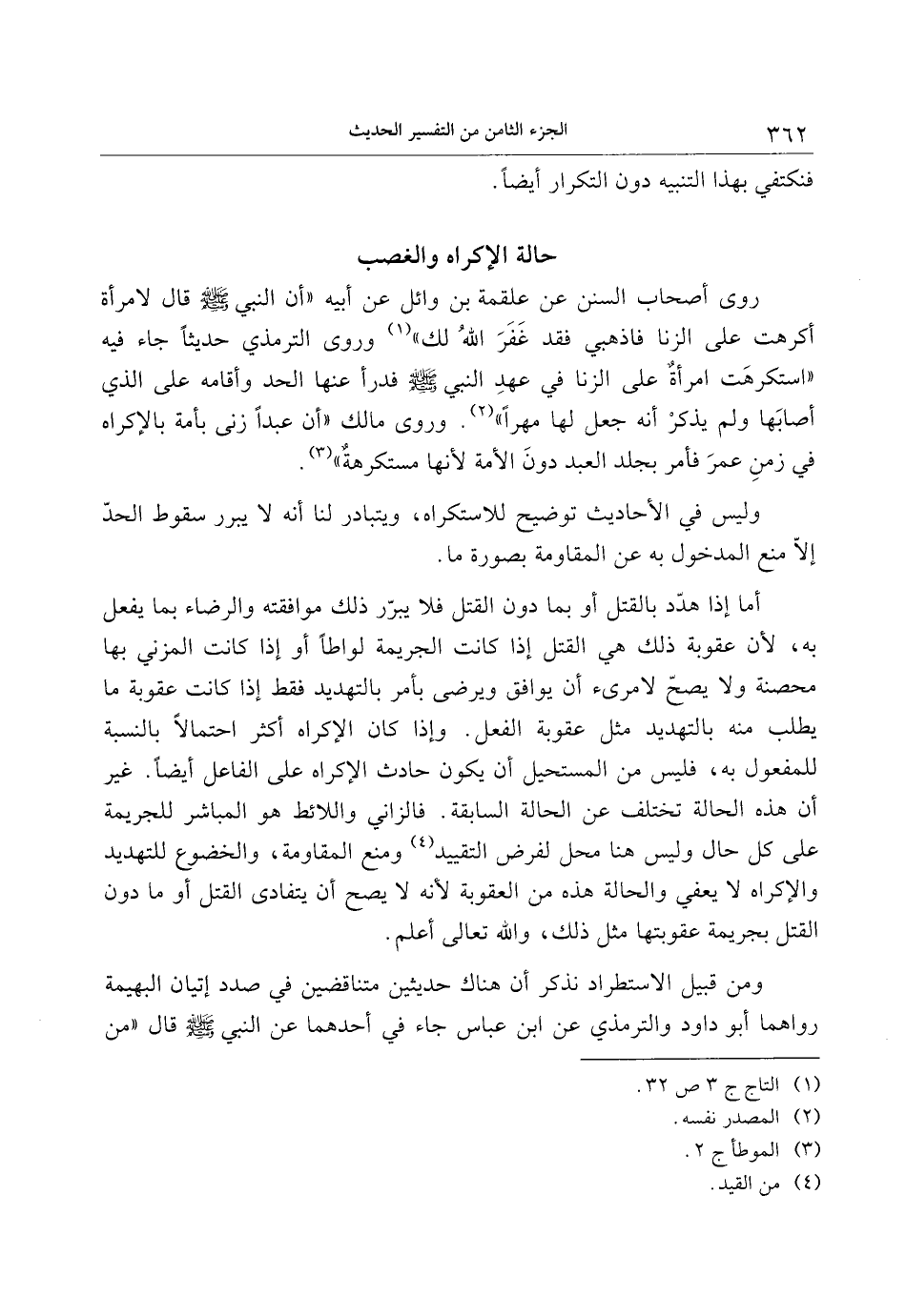 أما إذا هدّد بالقتل أو بما دون القتل فلا يبرّر ذلك موافقته والرضاء بما يفعل به، لأن عقوبة ذلك هي القتل إذا كانت الجريمة لواطا أو إذا كانت المزني بها محصنة ولا يصحّ لامرىء أن يوافق ويرضى بأمر بالتهديد فقط إذا كانت عقوبة ما يطلب منه بالتهديد مثل عقوبة الفعل. وإذا كان الإكراه أكثر احتمالا بالنسبة للمفعول به، فليس من المستحيل أن يكون حادث الإكراه على الفاعل أيضا. غير أن هذه الحالة تختلف عن الحالة السابقة. فالزاني واللائط هو المباشر للجريمة على كل حال وليس هنا محل لفرض التقييد «4» ومنع المقاومة، والخضوع للتهديد والإكراه لا يعفي والحالة هذه من العقوبة لأنه لا يصح أن يتفادى القتل أو ما دون القتل بجريمة عقوبتها مثل ذلك، والله تعالى أعلم.