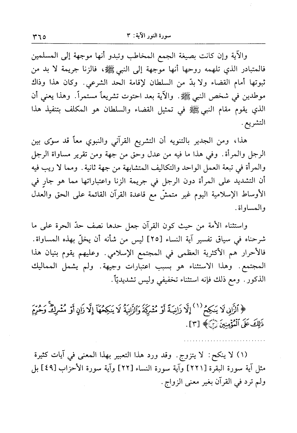 هذا، ومن الجدير بالتنويه أن التشريع القرآني والنبوي معا قد سوّى بين الرجل والمرأة. وفي هذا ما فيه من عدل وحق من جهة ومن تقرير مساواة الرجل والمرأة في تبعة العمل الواحد والتكاليف المتشابهة من جهة ثانية. ومما لا ريب فيه أن التشديد على المرأة دون الرجل في جريمة الزنا واعتباراتها مما هو جار في الأوساط الإسلامية اليوم غير متمشّ مع قاعدة القرآن القائمة على الحق والعدل والمساواة.