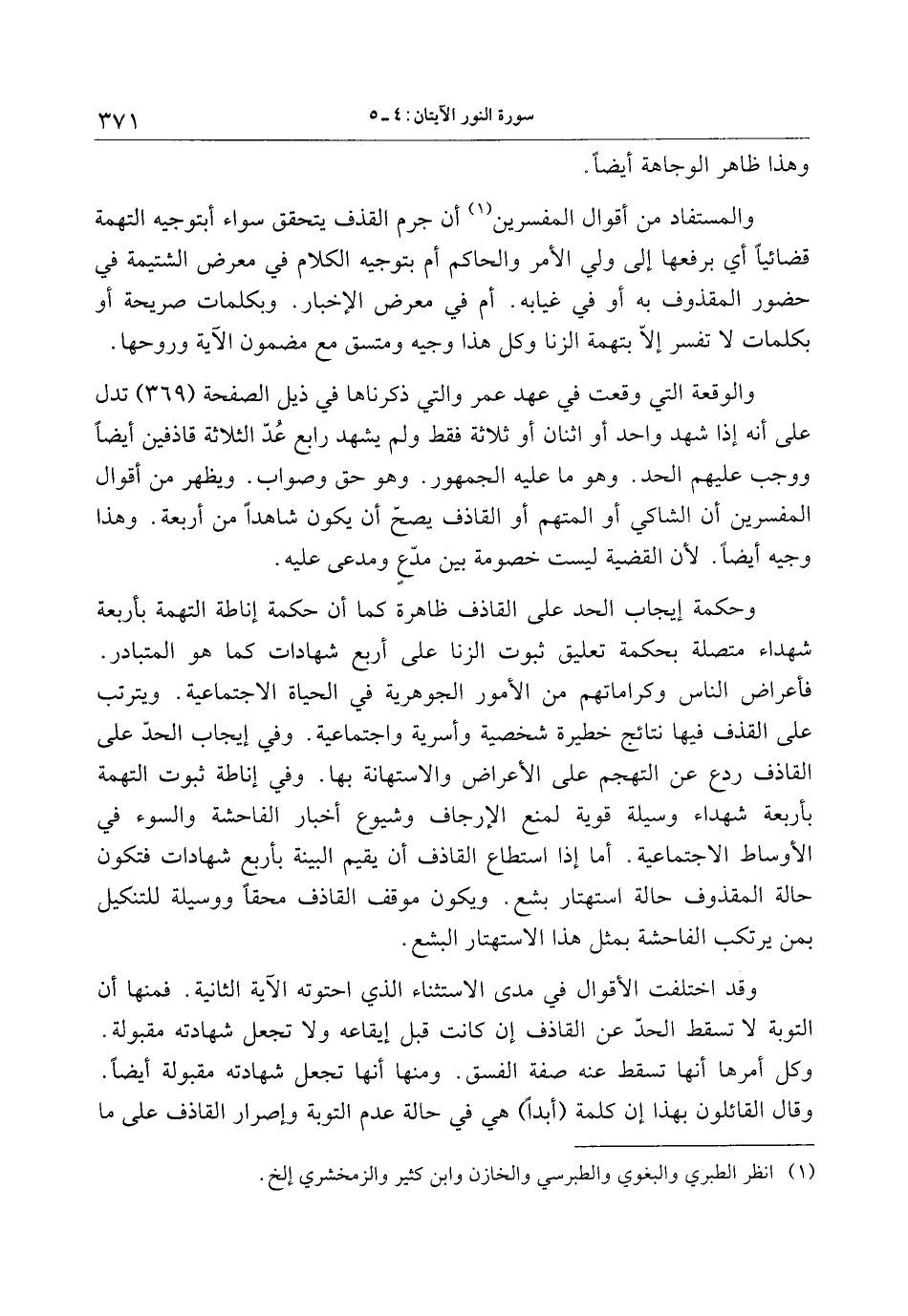 والوقعة التي وقعت في عهد عمر والتي ذكرناها في ذيل الصفحة (369) تدل على أنه إذا شهد واحد أو اثنان أو ثلاثة فقط ولم يشهد رابع عدّ الثلاثة قاذفين أيضا ووجب عليهم الحد. وهو ما عليه الجمهور. وهو حق وصواب. ويظهر من أقوال المفسرين أن الشاكي أو المتهم أو القاذف يصحّ أن يكون شاهدا من أربعة. وهذا وجيه أيضا. لأن القضية ليست خصومة بين مدّع ومدعى عليه.