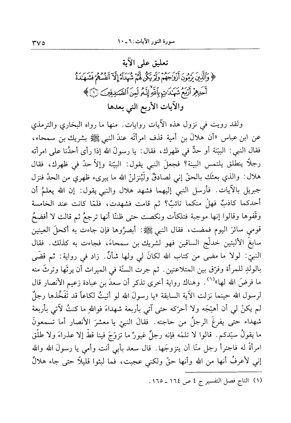 تعليق على الآية وَالَّذِينَ يَرْمُونَ أَزْواجَهُمْ وَلَمْ يَكُنْ لَهُمْ شُهَداءُ إِلَّا أَنْفُسُهُمْ فَشَهادَةُ أَحَدِهِمْ أَرْبَعُ شَهاداتٍ بِاللَّهِ إِنَّهُ لَمِنَ الصَّادِقِينَ (6) والآيات الأربع التي بعدها