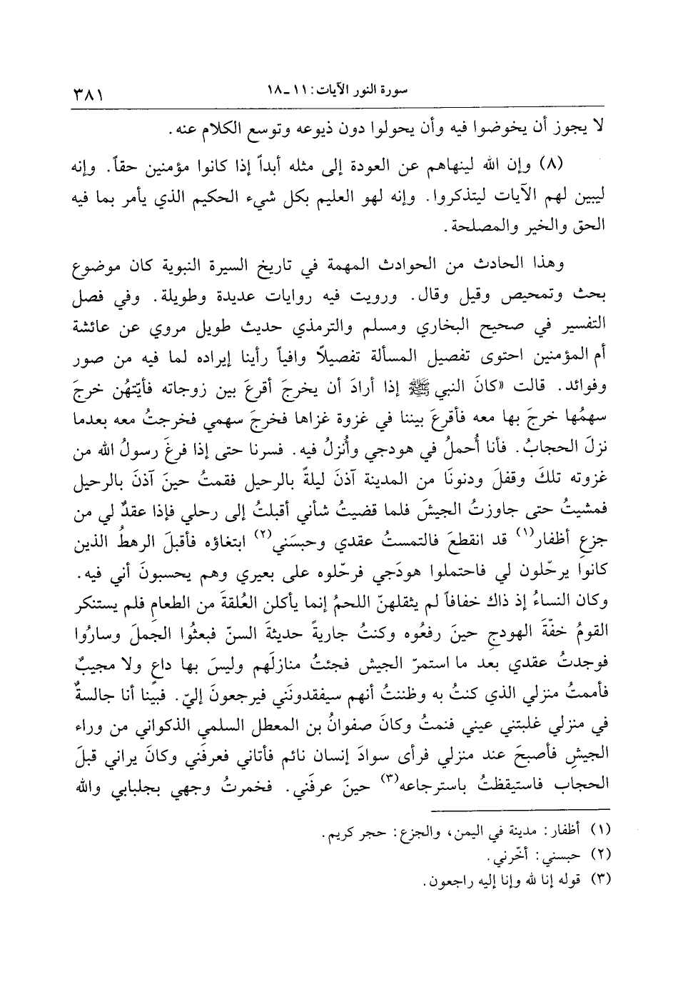 وكان النساء إذ ذاك خفافا لم يثقلهنّ اللحم إنما يأكلن العلقة من الطعام فلم يستنكر القوم خفّة الهودج حين رفعوه وكنت جارية حديثة السنّ فبعثوا الجمل وساروا فوجدت عقدي بعد ما استمرّ الجيش فجئت منازلهم وليس بها داع ولا مجيب فأممت منزلي الذي كنت به وظننت أنهم سيفقدونني فيرجعون إليّ. فبينا أنا جالسة في منزلي غلبتني عيني فنمت وكان صفوان بن المعطل السلمي الذكواني من وراء الجيش فأصبح عند منزلي فرأى سواد إنسان نائم فأتاني فعرفني وكان يراني قبل الحجاب فاستيقظت باسترجاعه «3» حين عرفني. فخمرت وجهي بجلبابي والله