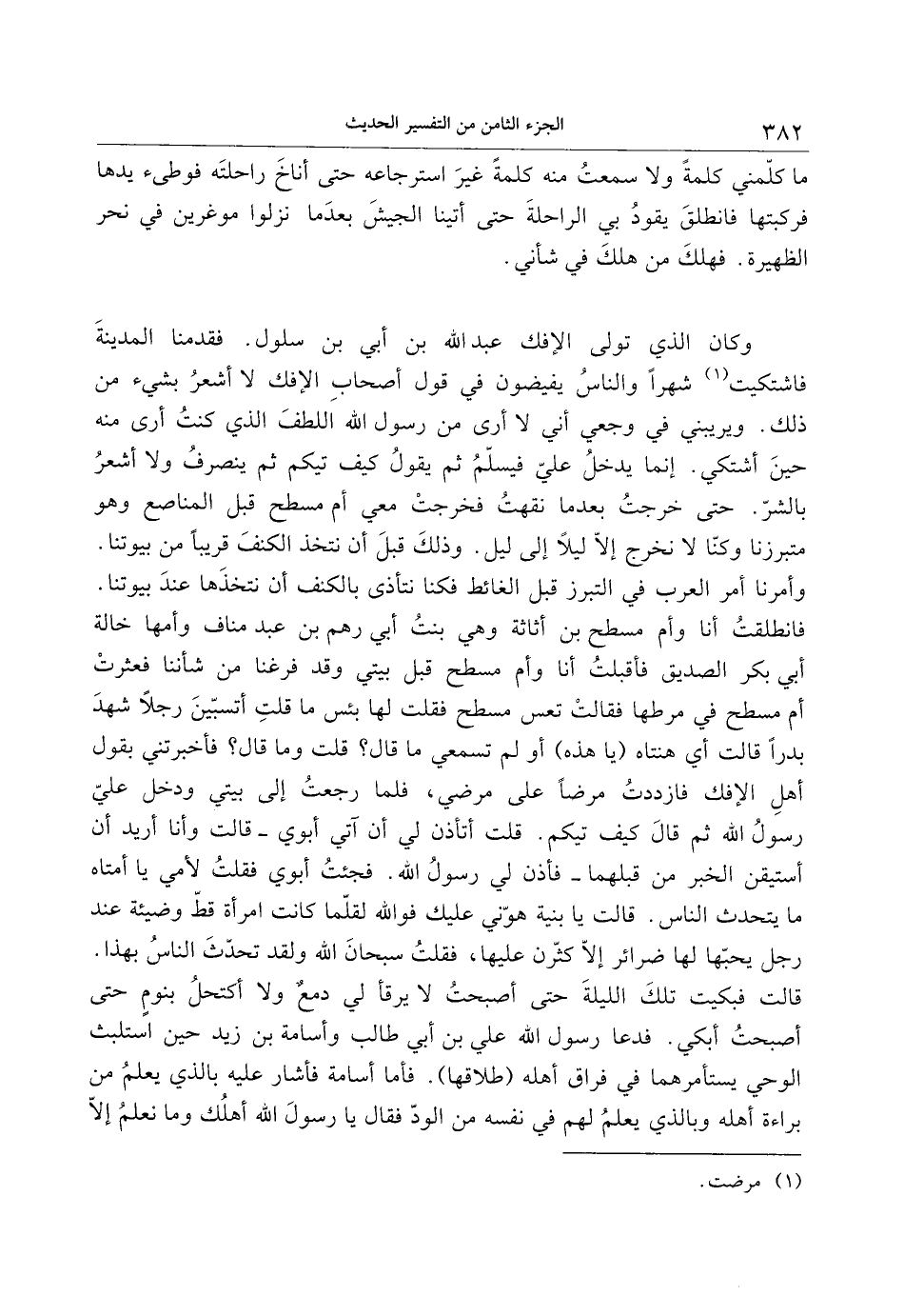 فانطلقت أنا وأم مسطح بن أثاثة وهي بنت أبي رهم بن عبد مناف وأمها خالة أبي بكر الصديق فأقبلت أنا وأم مسطح قبل بيتي وقد فرغنا من شأننا فعثرت أم مسطح في مرطها فقالت تعس مسطح فقلت لها بئس ما قلت أتسبّين رجلا شهد بدرا قالت أي هنتاه (يا هذه) أو لم تسمعي ما قال؟ قلت وما قال؟ فأخبرتني بقول أهل الإفك فازددت مرضا على مرضي، فلما رجعت إلى بيتي ودخل عليّ رسول الله ثم قال كيف تيكم. قلت أتأذن لي أن آتي أبوي- قالت وأنا أريد أن أستيقن الخبر من قبلهما- فأذن لي رسول الله. فجئت أبوي فقلت لأمي يا أمتاه ما يتحدث الناس. قالت يا بنية هوّني عليك فو الله لقلّما كانت امرأة قطّ وضيئة عند رجل يحبّها لها ضرائر إلّا كثّرن عليها، فقلت سبحان الله ولقد تحدّث الناس بهذا.