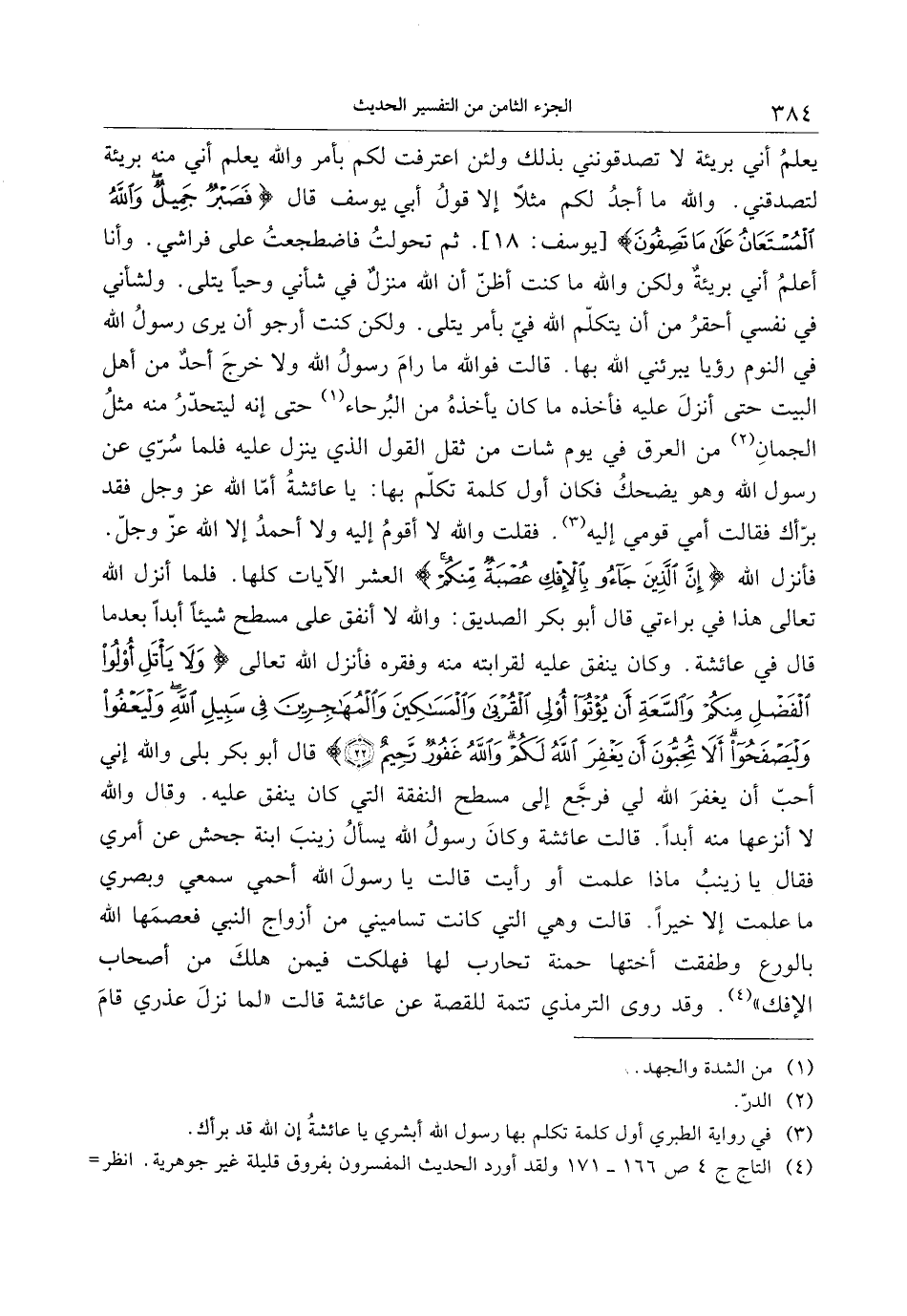 فأنزل الله إِنَّ الَّذِينَ جاؤُ بِالْإِفْكِ عُصْبَةٌ مِنْكُمْ العشر الآيات كلها. فلما أنزل الله تعالى هذا في براءتي قال أبو بكر الصديق: والله لا أنفق على مسطح شيئا أبدا بعد ما قال في عائشة. وكان ينفق عليه لقرابته منه وفقره فأنزل الله تعالى وَلا يَأْتَلِ أُولُوا الْفَضْلِ مِنْكُمْ وَالسَّعَةِ أَنْ يُؤْتُوا أُولِي الْقُرْبى وَالْمَساكِينَ وَالْمُهاجِرِينَ فِي سَبِيلِ اللَّهِ وَلْيَعْفُوا وَلْيَصْفَحُوا أَلا تُحِبُّونَ أَنْ يَغْفِرَ اللَّهُ لَكُمْ وَاللَّهُ غَفُورٌ رَحِيمٌ (22) قال أبو بكر بلى والله إني أحبّ أن يغفر الله لي فرجّع إلى مسطح النفقة التي كان ينفق عليه. وقال والله لا أنزعها منه أبدا. قالت عائشة وكان رسول الله يسأل زينب ابنة جحش عن أمري فقال يا زينب ماذا علمت أو رأيت قالت يا رسول الله أحمي سمعي وبصري ما علمت إلا خيرا. قالت وهي التي كانت تساميني من أزواج النبي فعصمها الله بالورع وطفقت أختها حمنة تحارب لها فهلكت فيمن هلك من أصحاب الإفك» «4» . وقد روى الترمذي تتمة للقصة عن عائشة قالت «لما نزل عذري قام