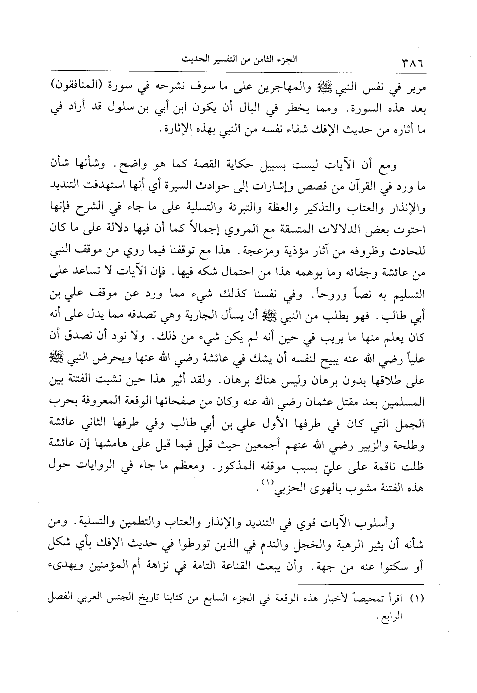 ومع أن الآيات ليست بسبيل حكاية القصة كما هو واضح. وشأنها شأن ما ورد في القرآن من قصص وإشارات إلى حوادث السيرة أي أنها استهدفت التنديد والإنذار والعتاب والتذكير والعظة والتبرئة والتسلية على ما جاء في الشرح فإنها احتوت بعض الدلالات المتسقة مع المروي إجمالا كما أن فيها دلالة على ما كان للحادث وظروفه من آثار مؤذية ومزعجة. هذا مع توقفنا فيما روي من موقف النبي من عائشة وجفائه وما يوهمه هذا من احتمال شكه فيها. فإن الآيات لا تساعد على التسليم به نصا وروحا. وفي نفسنا كذلك شيء مما ورد عن موقف علي بن أبي طالب. فهو يطلب من النبي صلى الله عليه وسلم أن يسأل الجارية وهي تصدقه مما يدل على أنه كان يعلم منها ما يريب في حين أنه لم يكن شيء من ذلك. ولا نود أن نصدق أن عليا رضي الله عنه يبيح لنفسه أن يشك في عائشة رضي الله عنها ويحرض النبي صلى الله عليه وسلم على طلاقها بدون برهان وليس هناك برهان. ولقد أثير هذا حين نشبت الفتنة بين المسلمين بعد مقتل عثمان رضي الله عنه وكان من صفحاتها الوقعة المعروفة بحرب الجمل التي كان في طرفها الأول علي بن أبي طالب وفي طرفها الثاني عائشة وطلحة والزبير رضي الله عنهم أجمعين حيث قيل فيما قيل على هامشها إن عائشة ظلت ناقمة على عليّ بسبب موقفه المذكور. ومعظم ما جاء في الروايات حول هذه الفتنة مشوب بالهوى الحزبي «1» .