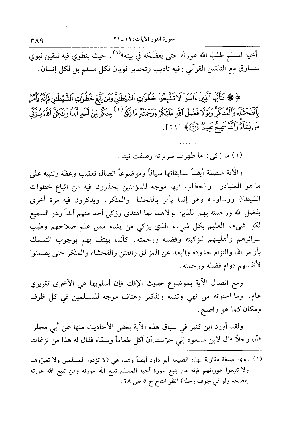 يا أَيُّهَا الَّذِينَ آمَنُوا لا تَتَّبِعُوا خُطُواتِ الشَّيْطانِ وَمَنْ يَتَّبِعْ خُطُواتِ الشَّيْطانِ فَإِنَّهُ يَأْمُرُ بِالْفَحْشاءِ وَالْمُنْكَرِ وَلَوْلا فَضْلُ اللَّهِ عَلَيْكُمْ وَرَحْمَتُهُ ما زَكى مِنْكُمْ مِنْ أَحَدٍ أَبَداً وَلكِنَّ اللَّهَ يُزَكِّي مَنْ يَشاءُ وَاللَّهُ سَمِيعٌ عَلِيمٌ (21)