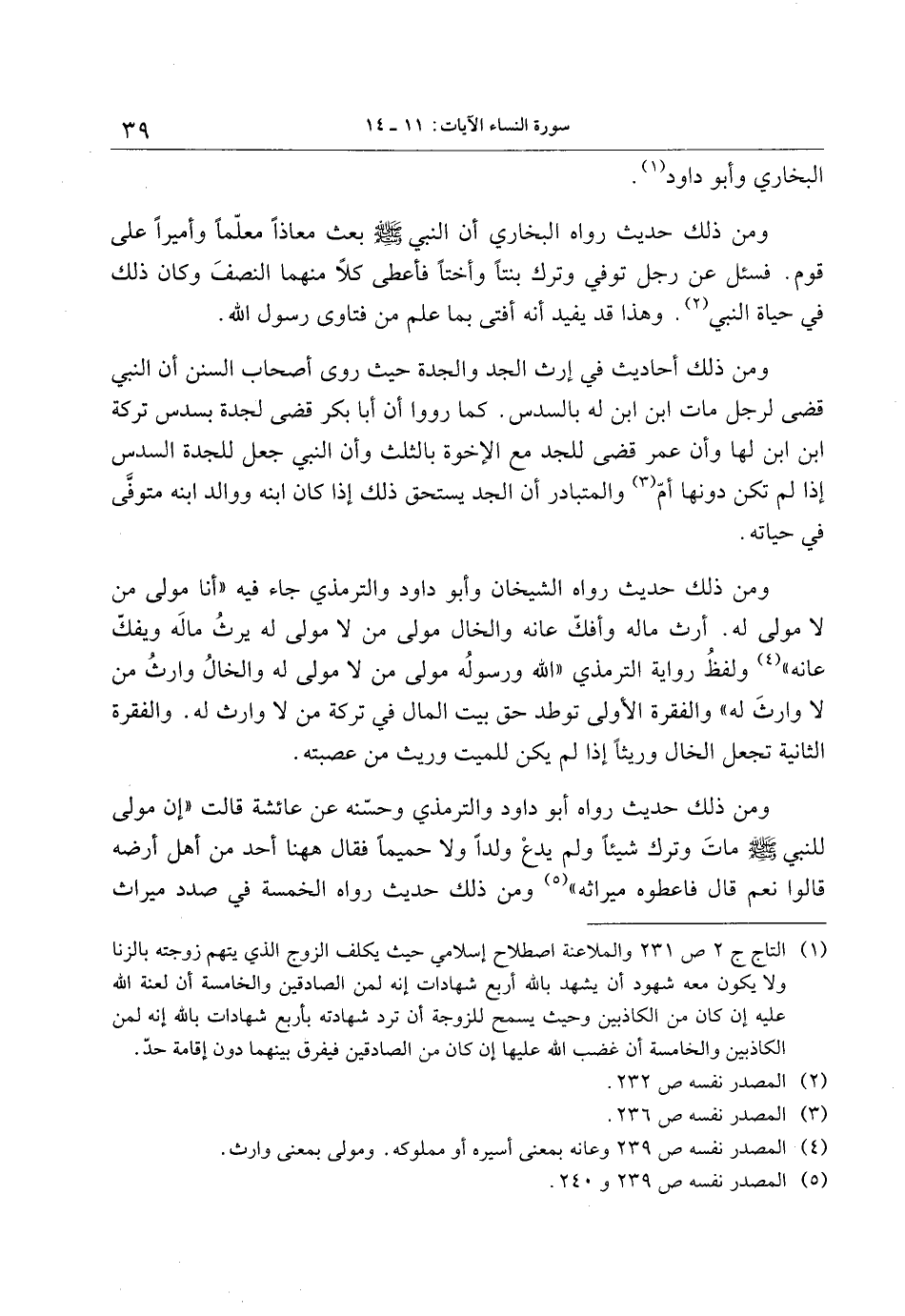 ومن ذلك أحاديث في إرث الجد والجدة حيث روى أصحاب السنن أن النبي قضى لرجل مات ابن ابن له بالسدس. كما رووا أن أبا بكر قضى لجدة بسدس تركة ابن ابن لها وأن عمر قضى للجد مع الإخوة بالثلث وأن النبي جعل للجدة السدس إذا لم تكن دونها أمّ «3» والمتبادر أن الجد يستحق ذلك إذا كان ابنه ووالد ابنه متوفّى في حياته.