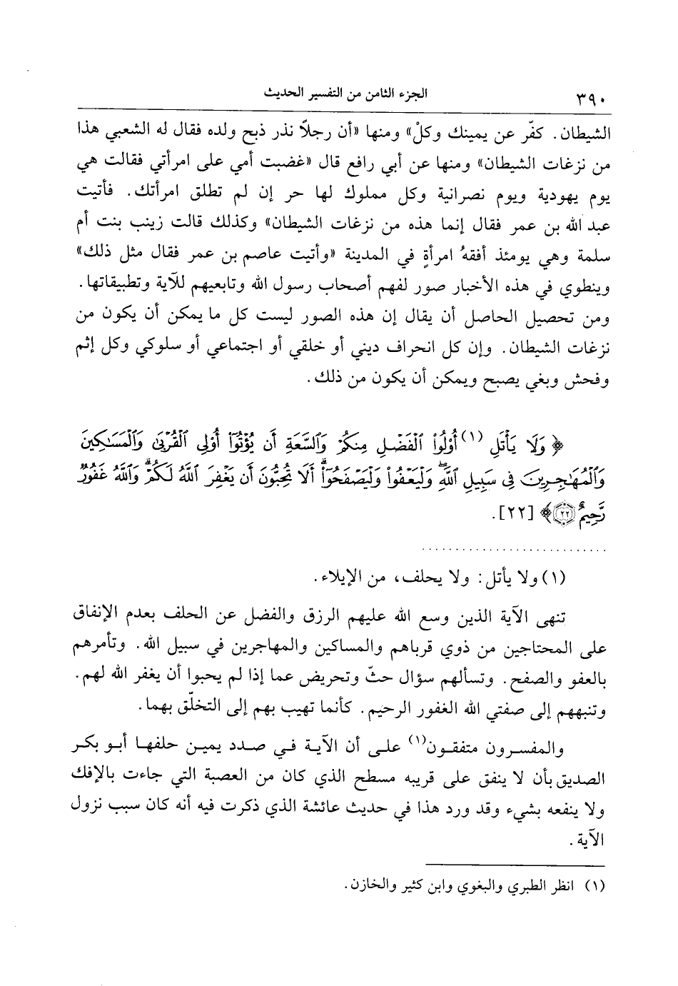 وَلا يَأْتَلِ أُولُوا الْفَضْلِ مِنْكُمْ وَالسَّعَةِ أَنْ يُؤْتُوا أُولِي الْقُرْبى وَالْمَساكِينَ وَالْمُهاجِرِينَ فِي سَبِيلِ اللَّهِ وَلْيَعْفُوا وَلْيَصْفَحُوا أَلا تُحِبُّونَ أَنْ يَغْفِرَ اللَّهُ لَكُمْ وَاللَّهُ غَفُورٌ رَحِيمٌ (22)