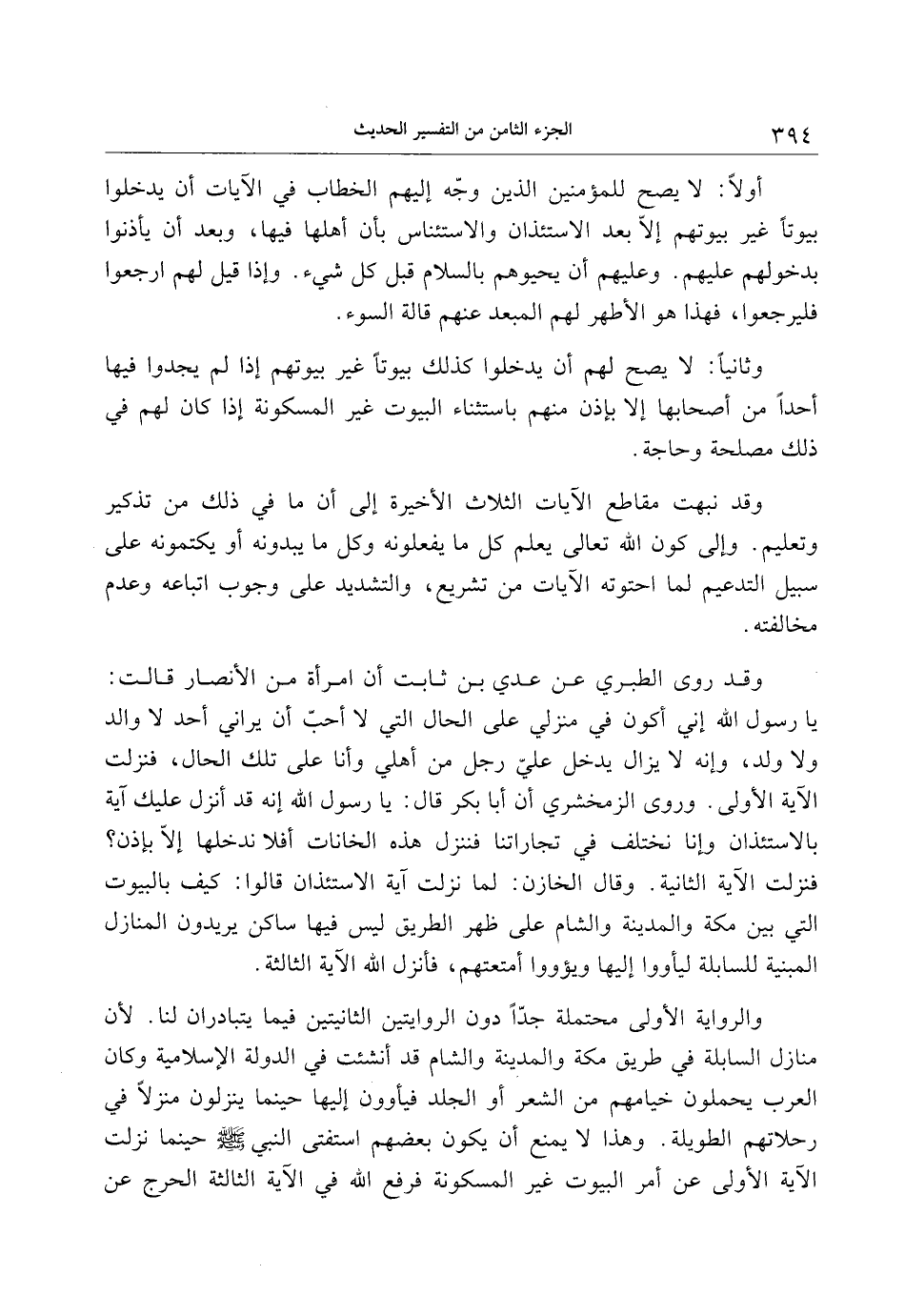فنزلت الآية الثانية. وقال الخازن: لما نزلت آية الاستئذان قالوا: كيف بالبيوت التي بين مكة والمدينة والشام على ظهر الطريق ليس فيها ساكن يريدون المنازل المبنية للسابلة ليأووا إليها ويؤووا أمتعتهم، فأنزل الله الآية الثالثة.