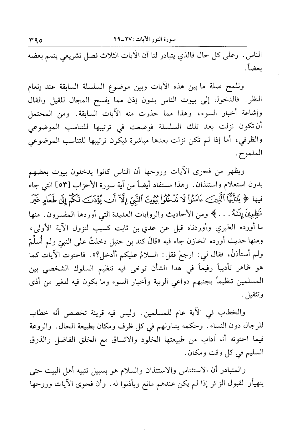 ومن الأحاديث والروايات العديدة التي أوردها المفسرون. منها ما أورده الطبري وأوردناه قبل عن عدي بن ثابت كسبب لنزول الآية الأولى، ومنها حديث أورده الخازن جاء فيه «قال كند بن حنبل دخلت على النبيّ ولم أسلّم ولم أستأذن، فقال لي: ارجع فقل: السلام عليكم أأدخل؟» . فاحتوت الآيات كما هو ظاهر تأديبا رفيعا في هذا الشأن توخى فيه تنظيم السلوك الشخصي بين المسلمين تنظيما يجنبهم دواعي الريبة وأخبار السوء وما يكون فيه للغير من أذى وتثقيل.