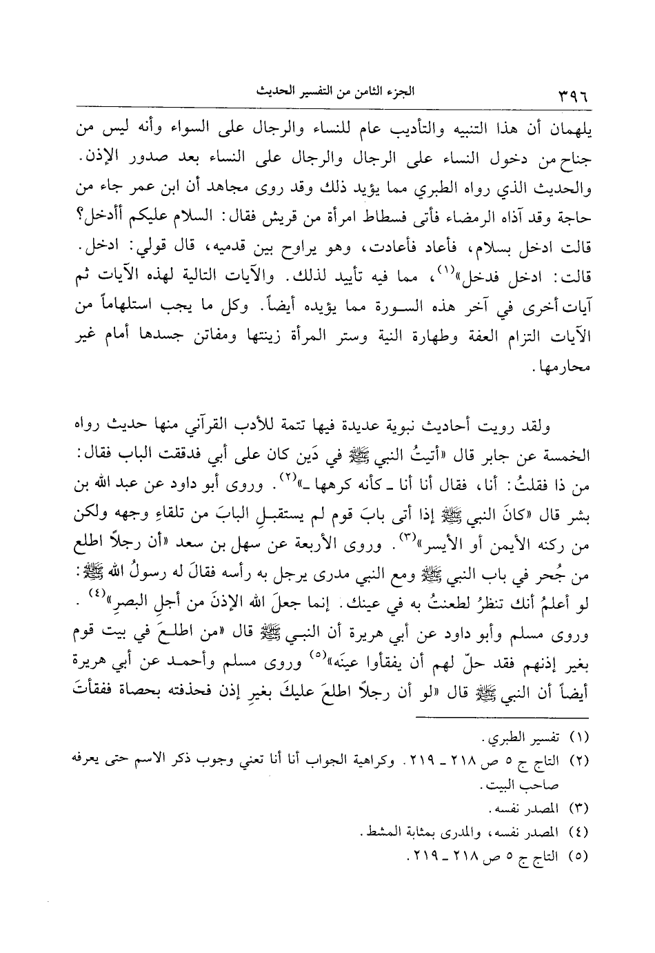 ولقد رويت أحاديث نبوية عديدة فيها تتمة للأدب القرآني منها حديث رواه الخمسة عن جابر قال «أتيت النبي صلى الله عليه وسلم في دين كان على أبي فدققت الباب فقال: