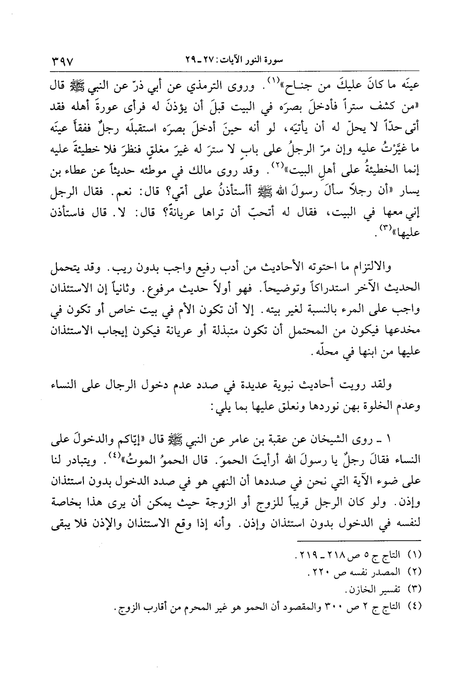 1- روى الشيخان عن عقبة بن عامر عن النبي صلى الله عليه وسلم قال «إيّاكم والدخول على النساء فقال رجل يا رسول الله أرأيت الحمو. قال الحمو الموت» «4» . ويتبادر لنا على ضوء الآية التي نحن في صددها أن النهي هو في صدد الدخول بدون استئذان وإذن. ولو كان الرجل قريبا للزوج أو الزوجة حيث يمكن أن يرى هذا بخاصة لنفسه في الدخول بدون استئذان وإذن. وأنه إذا وقع الاستئذان والإذن فلا يبقى