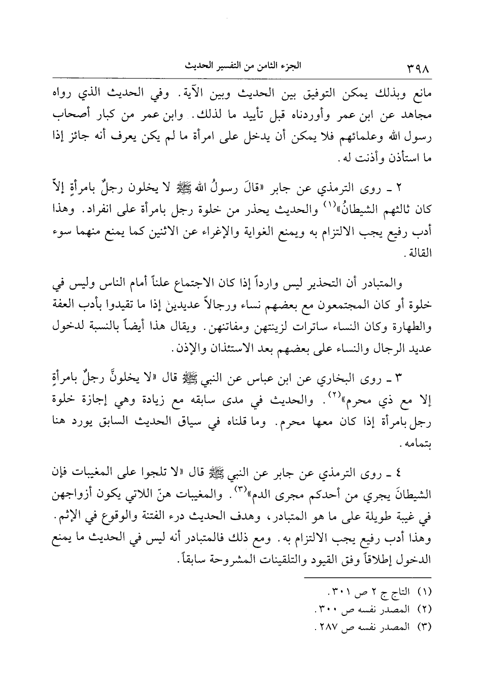 4- روى الترمذي عن جابر عن النبي صلى الله عليه وسلم قال «لا تلجوا على المغيبات فإن الشيطان يجري من أحدكم مجرى الدم» «3» . والمغيبات هنّ اللاتي يكون أزواجهن في غيبة طويلة على ما هو المتبادر، وهدف الحديث درء الفتنة والوقوع في الإثم.