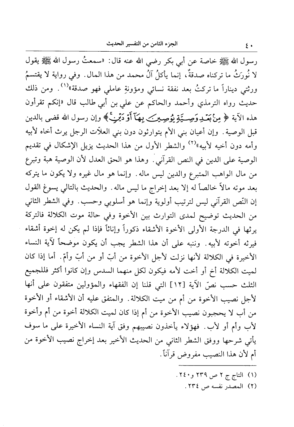 رسول الله صلى الله عليه وسلم خاصة عن أبي بكر رضي الله عنه قال: «سمعت رسول الله صلى الله عليه وسلم يقول لا نورث ما تركناه صدقة، إنما يأكل آل محمد من هذا المال. وفي رواية لا يقتسم ورثتي دينارا ما تركت بعد نفقة نسائي ومؤونة عاملي فهو صدقة» «1» . ومن ذلك حديث رواه الترمذي وأحمد والحاكم عن علي بن أبي طالب قال «إنكم تقرءون هذه الآية مِنْ بَعْدِ وَصِيَّةٍ يُوصِينَ بِها أَوْ دَيْنٍ وإن رسول الله قضى بالدين قبل الوصية. وإن أعيان بني الأم يتوارثون دون بني العلّات الرجل يرث أخاه لأبيه وأمه دون أخيه لأبيه» «2» والشطر الأول من هذا الحديث يزيل الإشكال في تقديم الوصية على الدين في النص القرآني. وهذا هو الحق العدل لأن الوصية هبة وتبرع من مال الواهب المتبرع والدين ليس ماله. وإنما هو مال غيره ولا يكون ما يتركه بعد موته مالا خالصا له إلا بعد إخراج ما ليس ماله. والحديث بالتالي يسوغ القول إن النّص القرآني ليس لترتيب أولوية وإنما هو أسلوبي وحسب. وفي الشطر الثاني من الحديث توضيح لمدى التوارث بين الأخوة وفي حالة موت الكلالة فالتركة يرثها في الدرجة الأولى الأخوة الأشقاء ذكورا وإناثا فإذا لم يكن له إخوة أشقاء فيرثه أخوته لأبيه. وننبه على أن هذا الشطر يجب أن يكون موضحا لآية النساء الأخيرة في الكلالة لأنها نزلت لأجل الأخوة من أب أو من أب وأمّ. أما إذا كان لميت الكلالة أخ أو أخت لأمه فيكون لكل منهما السدس وإن كانوا أكثر فللجميع الثلث حسب نصّ الآية [12] التي قلنا إن الفقهاء والمؤولين متفقون على أنها لأجل نصيب الأخوة من أم من ميت الكلالة. والمتفق عليه أن الأشقاء أو الأخوة من أب لا يحجبون نصيب الأخوة من أم إذا كان لميت الكلالة أخوة من أم وأخوة لأب وأم أو لأب. فهؤلاء يأخذون نصيبهم وفق آية النساء الأخيرة على ما سوف يأتي شرحها ووفق الشطر الثاني من الحديث الأخير بعد إخراج نصيب الأخوة من أم لأن هذا النصيب مفروض قرآنا.