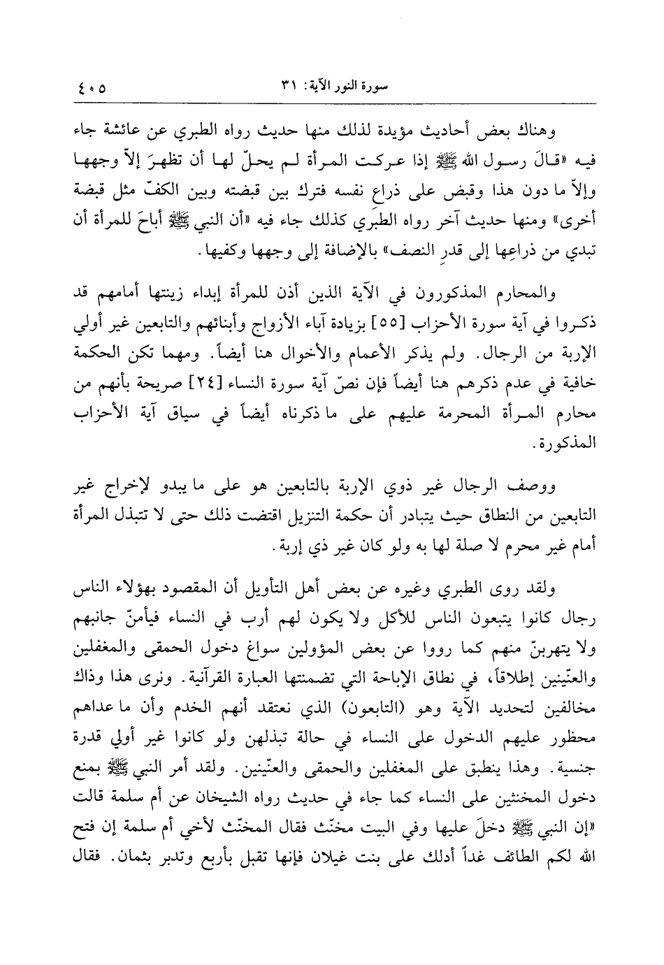 ولقد روى الطبري وغيره عن بعض أهل التأويل أن المقصود بهؤلاء الناس رجال كانوا يتبعون الناس للأكل ولا يكون لهم أرب في النساء فيأمنّ جانبهم ولا يتهربنّ منهم كما رووا عن بعض المؤولين سواغ دخول الحمقى والمغفلين والعنّينين إطلاقا، في نطاق الإباحة التي تضمنتها العبارة القرآنية. ونرى هذا وذاك مخالفين لتحديد الآية وهو (التابعون) الذي نعتقد أنهم الخدم وأن ما عداهم محظور عليهم الدخول على النساء في حالة تبذلهن ولو كانوا غير أولي قدرة جنسية. وهذا ينطبق على المغفلين والحمقى والعنّينين. ولقد أمر النبي صلى الله عليه وسلم بمنع دخول المخنثين على النساء كما جاء في حديث رواه الشيخان عن أم سلمة قالت «إن النبي صلى الله عليه وسلم دخل عليها وفي البيت مخنّث فقال المخنّث لأخي أم سلمة إن فتح الله لكم الطائف غدا أدلك على بنت غيلان فإنها تقبل بأربع وتدبر بثمان. فقال