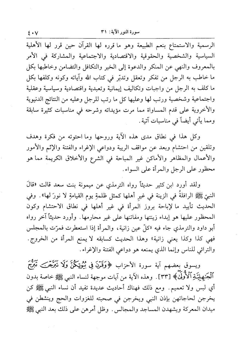 ولقد أورد ابن كثير حديثا رواه الترمذي عن ميمونة بنت سعد قالت «قال النبيّ صلى الله عليه وسلم الرافلة في الزينة في غير أهلها كمثل ظلمة يوم القيامة لا نور لها» . وفي الحديث تأييد ما لإباحة بروز المرأة في غير أهلها في نطاق الاحتشام وكون المحظور عليها هو إبداء زينتها ومفاتنها على غير محارمها. وأورد حديثا آخر رواه أبو داود والترمذي جاء فيه «كلّ عين زانية، والمرأة إذا استعطرت فمرّت بالمجلس فهي كذا وكذا يعني زانية» وهذا الحديث كسابقه لا يمنع المرأة من الخروج.
