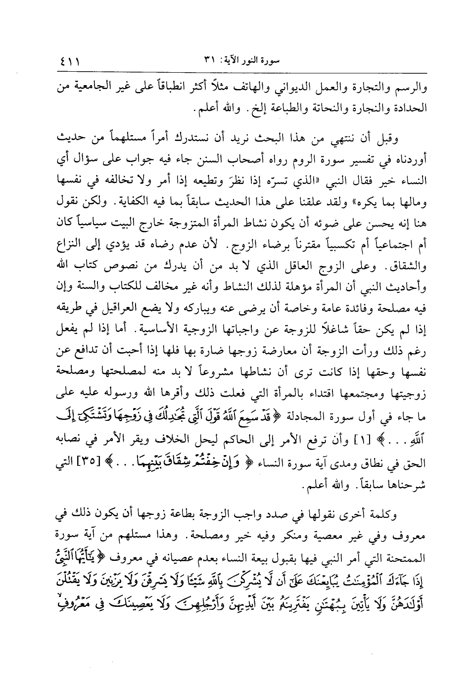 وقبل أن ننتهي من هذا البحث نريد أن نستدرك أمرا مستلهما من حديث أوردناه في تفسير سورة الروم رواه أصحاب السنن جاء فيه جواب على سؤال أي النساء خير فقال النبي «الذي تسرّه إذا نظر وتطيعه إذا أمر ولا تخالفه في نفسها ومالها بما يكره» ولقد علقنا على هذا الحديث سابقا بما فيه الكفاية. ولكن نقول هنا إنه يحسن على ضوئه أن يكون نشاط المرأة المتزوجة خارج البيت سياسيا كان أم اجتماعيا أم تكسبيا مقترنا برضاء الزوج. لأن عدم رضاه قد يؤدي إلى النزاع والشقاق. وعلى الزوج العاقل الذي لا بد من أن يدرك من نصوص كتاب الله وأحاديث النبي أن المرأة مؤهلة لذلك النشاط وأنه غير مخالف للكتاب والسنة وإن فيه مصلحة وفائدة عامة وخاصة أن يرضى عنه ويباركه ولا يضع العراقيل في طريقه إذا لم يكن حقا شاغلا للزوجة عن واجباتها الزوجية الأساسية. أما إذا لم يفعل رغم ذلك ورأت الزوجة أن معارضة زوجها ضارة بها فلها إذا أحبت أن تدافع عن نفسها وحقها إذا كانت ترى أن نشاطها مشروعا لا بد منه لمصلحتها ومصلحة زوجيتها ومجتمعها اقتداء بالمرأة التي فعلت ذلك وأقرها الله ورسوله عليه على ما جاء في أول سورة المجادلة قَدْ سَمِعَ اللَّهُ قَوْلَ الَّتِي تُجادِلُكَ فِي زَوْجِها وَتَشْتَكِي إِلَى اللَّهِ ... [1] وأن ترفع الأمر إلى الحاكم ليحل الخلاف ويقر الأمر في نصابه الحق في نطاق ومدى آية سورة النساء وَإِنْ خِفْتُمْ شِقاقَ بَيْنِهِما ... [35] التي شرحناها سابقا. والله أعلم.