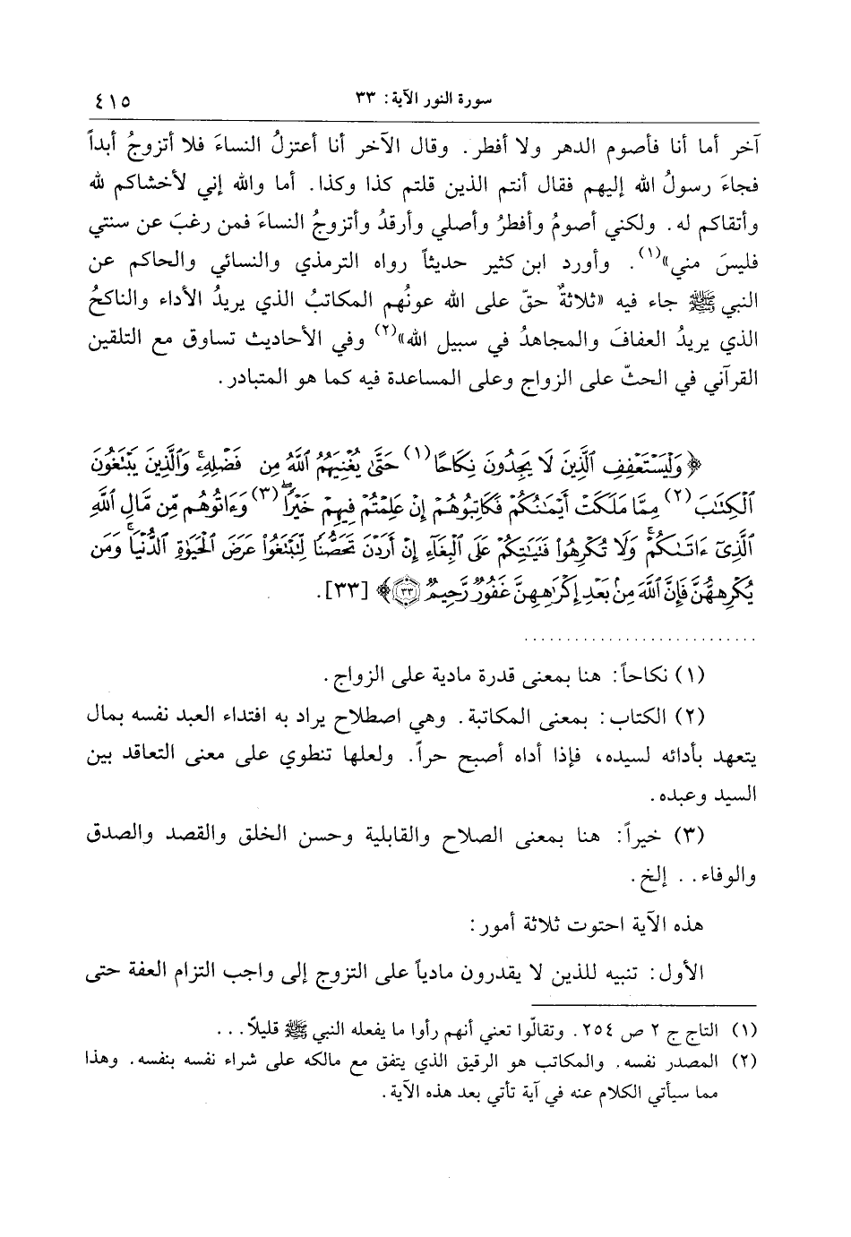 (2) المصدر نفسه. والمكاتب هو الرقيق الذي يتفق مع مالكه على شراء نفسه بنفسه. وهذا مما سيأتي الكلام عنه في آية تأتي بعد هذه الآية.