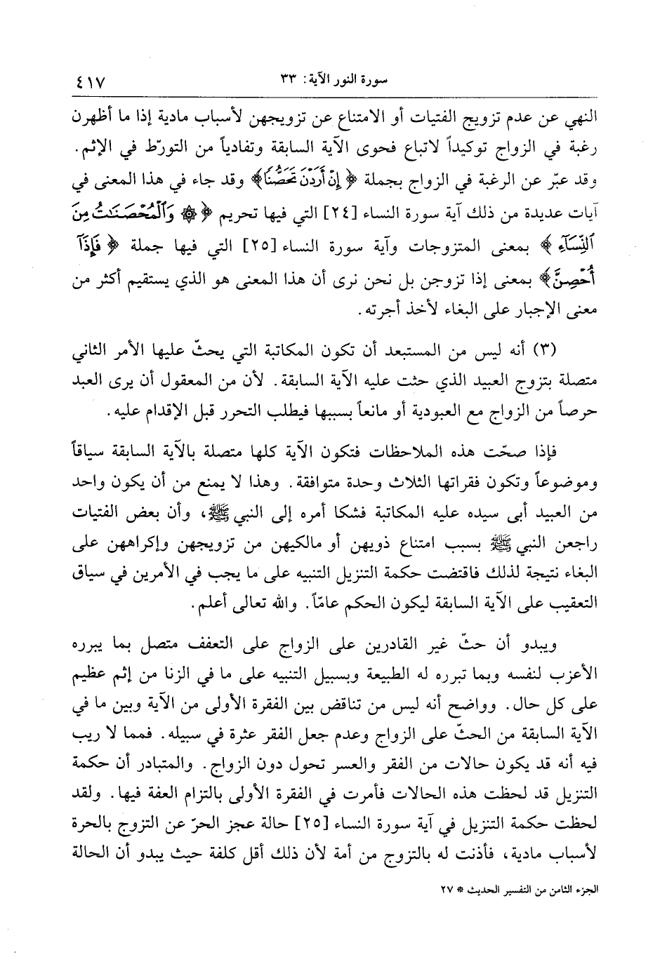 ويبدو أن حثّ غير القادرين على الزواج على التعفف متصل بما يبرره الأعزب لنفسه وبما تبرره له الطبيعة وبسبيل التنبيه على ما في الزنا من إثم عظيم على كل حال. وواضح أنه ليس من تناقض بين الفقرة الأولى من الآية وبين ما في الآية السابقة من الحثّ على الزواج وعدم جعل الفقر عثرة في سبيله. فمما لا ريب فيه أنه قد يكون حالات من الفقر والعسر تحول دون الزواج. والمتبادر أن حكمة التنزيل قد لحظت هذه الحالات فأمرت في الفقرة الأولى بالتزام العفة فيها. ولقد لحظت حكمة التنزيل في آية سورة النساء [25] حالة عجز الحرّ عن التزوج بالحرة لأسباب مادية، فأذنت له بالتزوج من أمة لأن ذلك أقل كلفة حيث يبدو أن الحالة الجزء الثامن من التفسير الحديث 27