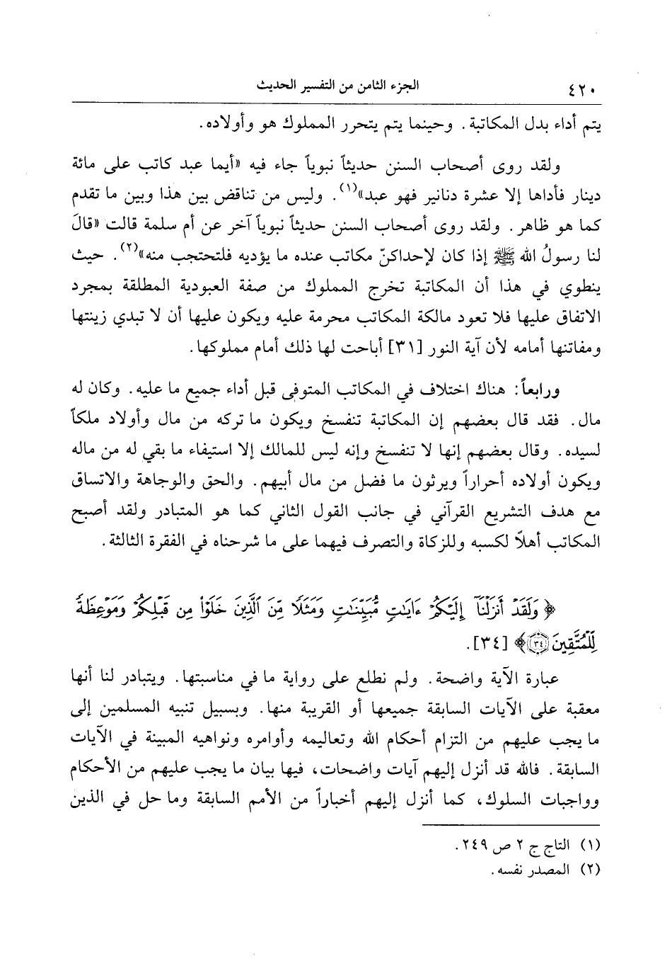 ولقد روى أصحاب السنن حديثا نبويا جاء فيه «أيما عبد كاتب على مائة دينار فأداها إلا عشرة دنانير فهو عبد» «1» . وليس من تناقض بين هذا وبين ما تقدم كما هو ظاهر. ولقد روى أصحاب السنن حديثا نبويا آخر عن أم سلمة قالت «قال لنا رسول الله صلى الله عليه وسلم إذا كان لإحداكنّ مكاتب عنده ما يؤديه فلتحتجب منه» «2» . حيث ينطوي في هذا أن المكاتبة تخرج المملوك من صفة العبودية المطلقة بمجرد الاتفاق عليها فلا تعود مالكة المكاتب محرمة عليه ويكون عليها أن لا تبدي زينتها ومفاتنها أمامه لأن آية النور [31] أباحت لها ذلك أمام مملوكها.