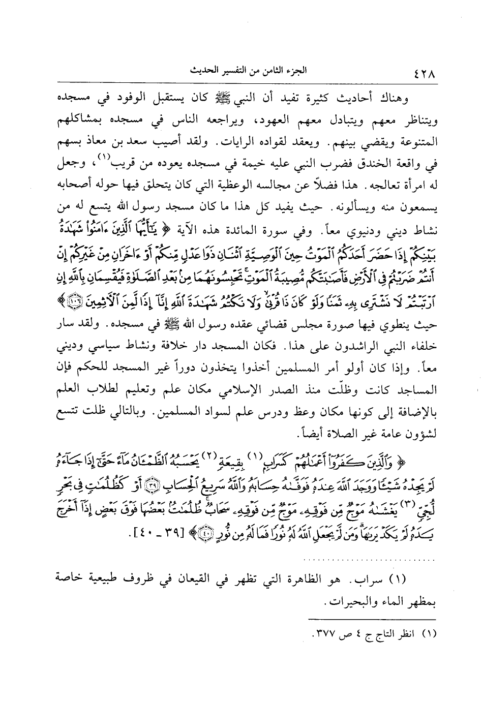وهناك أحاديث كثيرة تفيد أن النبي صلى الله عليه وسلم كان يستقبل الوفود في مسجده ويتناظر معهم ويتبادل معهم العهود، ويراجعه الناس في مسجده بمشاكلهم المتنوعة ويقضي بينهم. ويعقد لقواده الرايات. ولقد أصيب سعد بن معاذ بسهم في واقعة الخندق فضرب النبي عليه خيمة في مسجده يعوده من قريب «1» ، وجعل له امرأة تعالجه. هذا فضلا عن مجالسه الوعظية التي كان يتحلق فيها حوله أصحابه يسمعون منه ويسألونه. حيث يفيد كل هذا ما كان مسجد رسول الله يتسع له من نشاط ديني ودنيوي معا. وفي سورة المائدة هذه الآية يا أَيُّهَا الَّذِينَ آمَنُوا شَهادَةُ بَيْنِكُمْ إِذا حَضَرَ أَحَدَكُمُ الْمَوْتُ حِينَ الْوَصِيَّةِ اثْنانِ ذَوا عَدْلٍ مِنْكُمْ أَوْ آخَرانِ مِنْ غَيْرِكُمْ إِنْ أَنْتُمْ ضَرَبْتُمْ فِي الْأَرْضِ فَأَصابَتْكُمْ مُصِيبَةُ الْمَوْتِ تَحْبِسُونَهُما مِنْ بَعْدِ الصَّلاةِ فَيُقْسِمانِ بِاللَّهِ إِنِ ارْتَبْتُمْ لا نَشْتَرِي بِهِ ثَمَناً وَلَوْ كانَ ذا قُرْبى وَلا نَكْتُمُ شَهادَةَ اللَّهِ إِنَّا إِذاً لَمِنَ الْآثِمِينَ (106) حيث ينطوي فيها صورة مجلس قضائي عقده رسول الله صلى الله عليه وسلم في مسجده. ولقد سار خلفاء النبي الراشدون على هذا. فكان المسجد دار خلافة ونشاط سياسي وديني معا. وإذا كان أولو أمر المسلمين أخذوا يتخذون دورا غير المسجد للحكم فإن المساجد كانت وظلّت منذ الصدر الإسلامي مكان علم وتعليم لطلاب العلم بالإضافة إلى كونها مكان وعظ ودرس علم لسواد المسلمين. وبالتالي ظلت تتسع لشؤون عامة غير الصلاة أيضا.