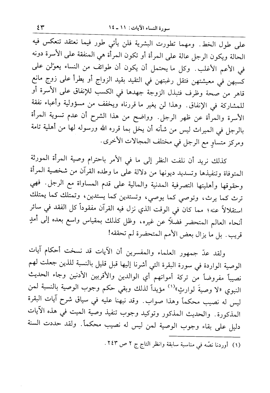على طول الخط. ومهما تطورت البشرية فلن يأتي طور فيما نعتقد تنعكس فيه الحالة ويكون الرجل عالة على المرأة أو تكون المرأة هي المنفقة على الأسرة دونه في الأعم الأغلب. وكل ما يحتمل أن يكون أن طوائف من النساء يعوّلن على كسبهن في معيشتهن فتقل رغبتهن في التقيد بقيد الزواج أو يطرأ على زوج مانع قاهر من صحة وظرف فتبذل الزوجة جهدها في الكسب للإنفاق على الأسرة أو للمشاركة في الإنفاق. وهذا لن يغير ما قررناه ويخفف من مسؤولية وأعباء نفقة الأسرة والمرأة عن ظهر الرجل. وواضح من هذا الشرح أن عدم تسوية المرأة بالرجل في الميراث ليس من شأنه أن يخل بما قرره الله ورسوله لها من أهلية تامة ومركز متساو مع الرجل في مختلف المجالات الأخرى.