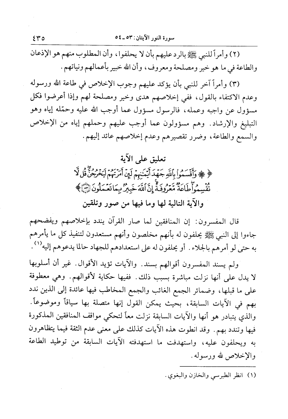 تعليق على الآية وَأَقْسَمُوا بِاللَّهِ جَهْدَ أَيْمانِهِمْ لَئِنْ أَمَرْتَهُمْ لَيَخْرُجُنَّ قُلْ لا تُقْسِمُوا طاعَةٌ مَعْرُوفَةٌ إِنَّ اللَّهَ خَبِيرٌ بِما تَعْمَلُونَ (53) والآية التالية لها وما فيها من صور وتلقين
