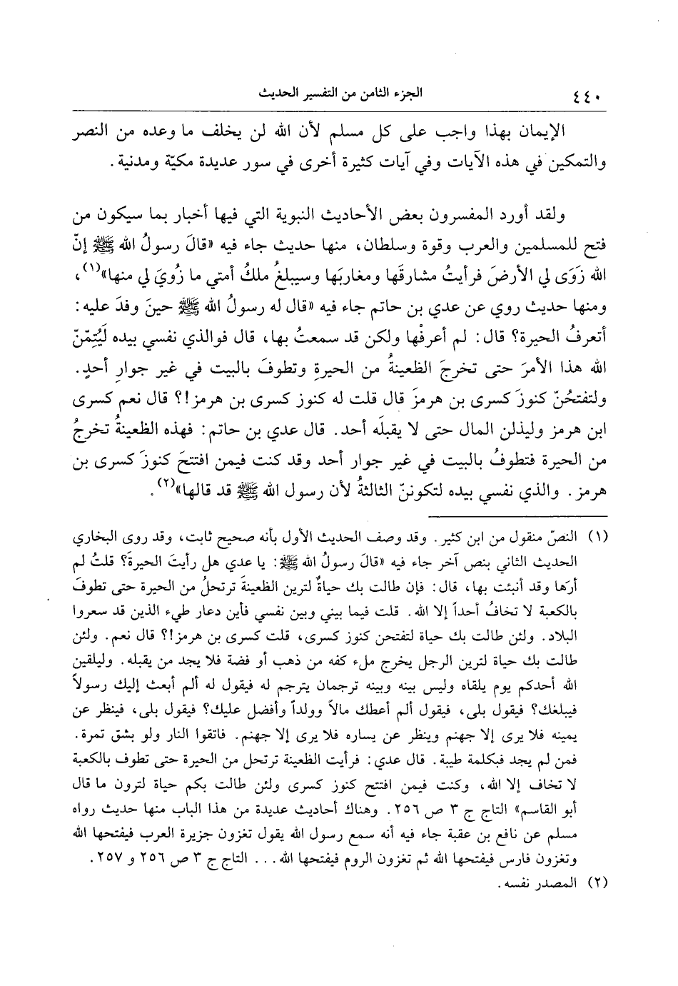 (1) النصّ منقول من ابن كثير. وقد وصف الحديث الأول بأنه صحيح ثابت، وقد روى البخاري الحديث الثاني بنص آخر جاء فيه «قال رسول الله صلى الله عليه وسلم: يا عدي هل رأيت الحيرة؟ قلت لم أرها وقد أنبئت بها، قال: فإن طالت بك حياة لترين الظعينة ترتحل من الحيرة حتى تطوف بالكعبة لا تخاف أحدا إلا الله. قلت فيما بيني وبين نفسي فأين دعار طيء الذين قد سعروا البلاد. ولئن طالت بك حياة لتفتحن كنوز كسرى، قلت كسرى بن هرمز!؟ قال نعم. ولئن طالت بك حياة لترين الرجل يخرج ملء كفه من ذهب أو فضة فلا يجد من يقبله. وليلقين الله أحدكم يوم يلقاه وليس بينه وبينه ترجمان يترجم له فيقول له ألم أبعث إليك رسولا فيبلغك؟ فيقول بلى، فيقول ألم أعطك مالا وولدا وأفضل عليك؟ فيقول بلى، فينظر عن يمينه فلا يرى إلا جهنم وينظر عن يساره فلا يرى إلا جهنم. فاتقوا النار ولو بشق تمرة.