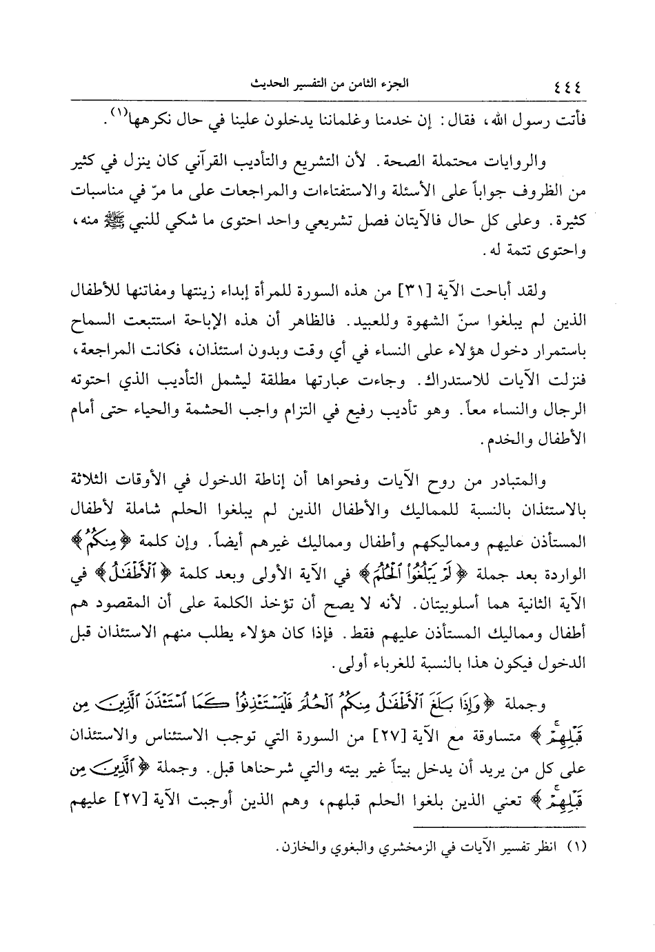 ولقد أباحت الآية [31] من هذه السورة للمرأة إبداء زينتها ومفاتنها للأطفال الذين لم يبلغوا سنّ الشهوة وللعبيد. فالظاهر أن هذه الإباحة استتبعت السماح باستمرار دخول هؤلاء على النساء في أي وقت وبدون استئذان، فكانت المراجعة، فنزلت الآيات للاستدراك. وجاءت عبارتها مطلقة ليشمل التأديب الذي احتوته الرجال والنساء معا. وهو تأديب رفيع في التزام واجب الحشمة والحياء حتى أمام الأطفال والخدم.
