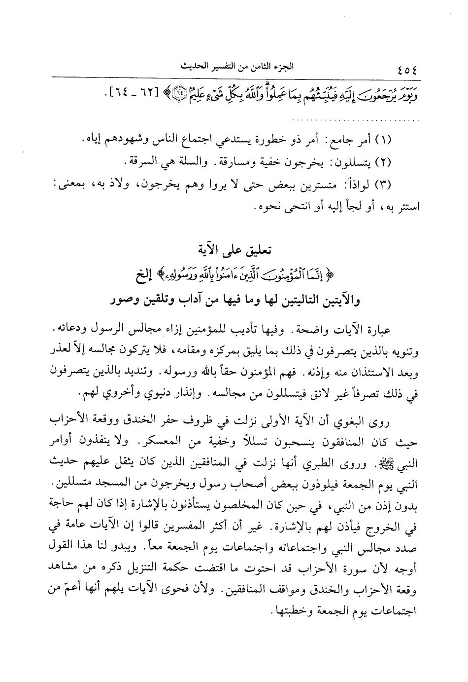 بدون إذن من النبي، في حين كان المخلصون يستأذنون بالإشارة إذا كان لهم حاجة في الخروج فيأذن لهم بالإشارة. غير أن أكثر المفسرين قالوا إن الآيات عامة في صدد مجالس النبي واجتماعاته واجتماعات يوم الجمعة معا. ويبدو لنا هذا القول أوجه لأن سورة الأحزاب قد احتوت ما اقتضت حكمة التنزيل ذكره من مشاهد وقعة الأحزاب والخندق ومواقف المنافقين. ولأن فحوى الآيات يلهم أنها أعمّ من اجتماعات يوم الجمعة وخطبتها.