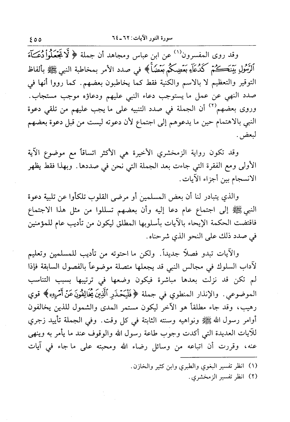 والآيات تبدو فصلا جديدا. ولكن ما احتوته من تأديب للمسلمين وتعليم لآداب السلوك في مجالس النبي قد يجعلها متصلة موضوعا بالفصول السابقة فإذا لم تكن قد نزلت بعدها مباشرة فيكون وضعها في ترتيبها بسبب التناسب الموضوعي. والإنذار المنطوي في جملة فَلْيَحْذَرِ الَّذِينَ يُخالِفُونَ عَنْ أَمْرِهِ قوي رهيب، وقد جاء مطلقا هو الآخر ليكون مستمر المدى والشمول للذين يخالفون أوامر رسول الله صلى الله عليه وسلم ونواهيه وسنته الثابتة في كل وقت. وفي الجملة تأييد زجري للآيات العديدة التي أكدت وجوب طاعة رسول الله والوقوف عند ما يأمر به وينهى عنه، وقررت أن اتباعه من وسائل رضاء الله ومحبته على ما جاء في آيات