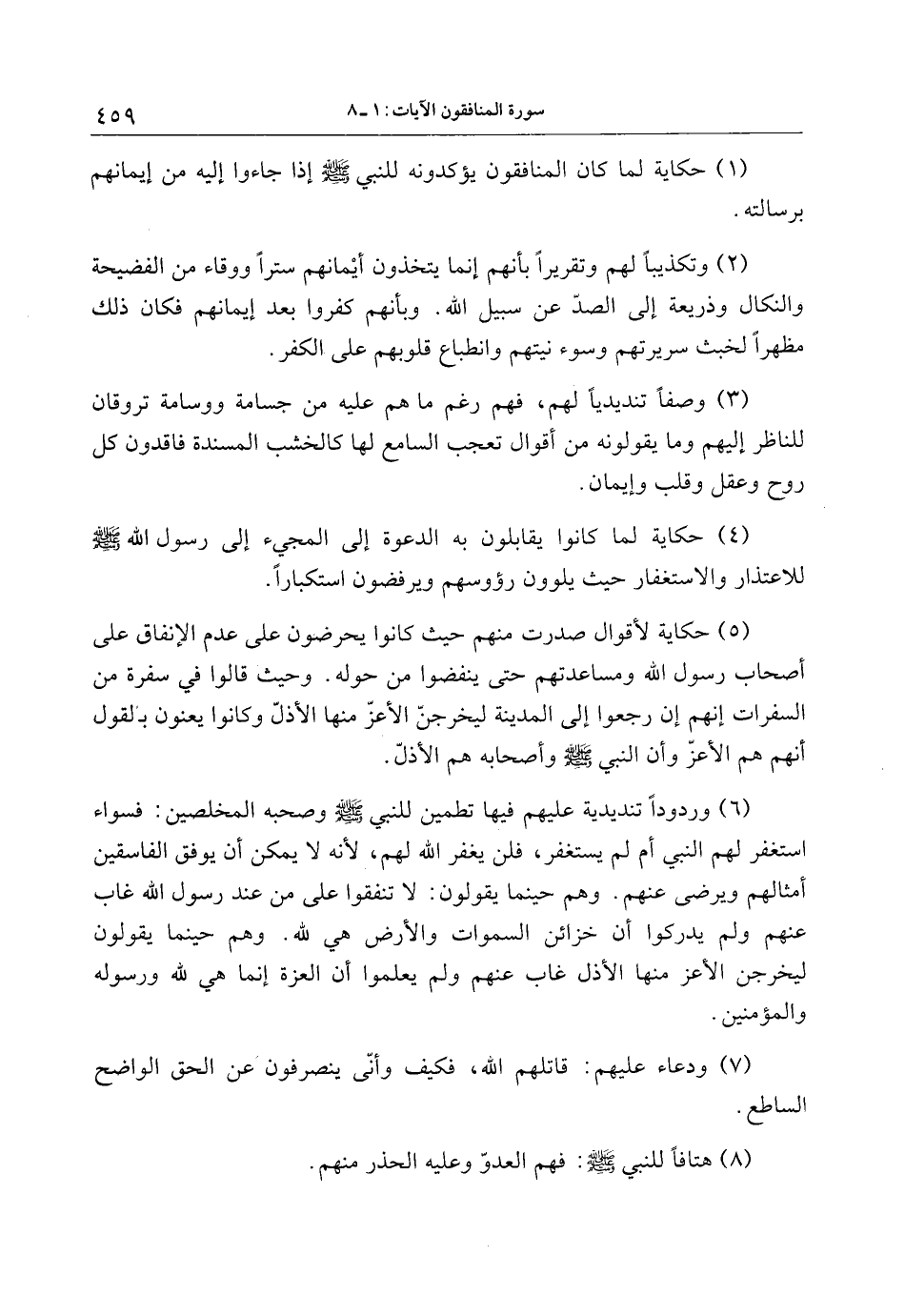 (6) وردودا تنديدية عليهم فيها تطمين للنبي صلى الله عليه وسلم وصحبه المخلصين: فسواء استغفر لهم النبي أم لم يستغفر، فلن يغفر الله لهم، لأنه لا يمكن أن يوفق الفاسقين أمثالهم ويرضى عنهم. وهم حينما يقولون: لا تنفقوا على من عند رسول الله غاب عنهم ولم يدركوا أن خزائن السموات والأرض هي لله. وهم حينما يقولون ليخرجن الأعز منها الأذل غاب عنهم ولم يعلموا أن العزة إنما هي لله ورسوله والمؤمنين.
