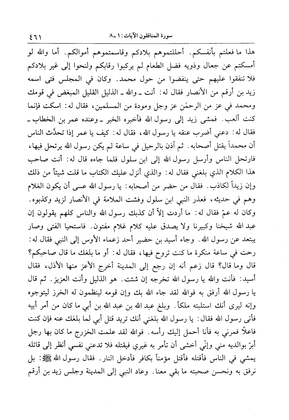 هذا ما فعلتم بأنفسكم. أحللتموهم بلادكم وقاسمتموهم أموالكم. أما والله لو أمسكتم عن جعال وذويه فضل الطعام لم يركبوا رقابكم ولنحوا إلى غير بلادكم فلا تنفقوا عليهم حتى ينفضوا من حول محمد. وكان في المجلس فتى اسمه زيد بن أرقم من الأنصار فقال له: أنت- والله- الذليل القليل المبغض في قومك ومحمد في عز من الرحمن عز وجل ومودة من المسلمين، فقال له: اسكت فإنما كنت ألعب. فمشى زيد إلى رسول الله فأخبره الخبر- وعنده عمر بن الخطاب- فقال له: دعني أضرب عنقه يا رسول الله، فقال له: كيف يا عمر إذا تحدّث الناس أن محمدا يقتل أصحابه. ثم آذن بالرحيل في ساعة لم يكن رسول الله يرتحل فيها، فارتحل الناس وأرسل رسول الله إلى ابن سلول فلما جاءه قال له: أنت صاحب هذا الكلام الذي بلغني فقال له: والذي أنزل عليك الكتاب ما قلت شيئا من ذلك وإن زيدا لكاذب. فقال من حضر من أصحابه: يا رسول الله عسى أن يكون الغلام وهم في حديثه، فعذر النبي ابن سلول وفشت الملامة في الأنصار لزيد وكذبوه.