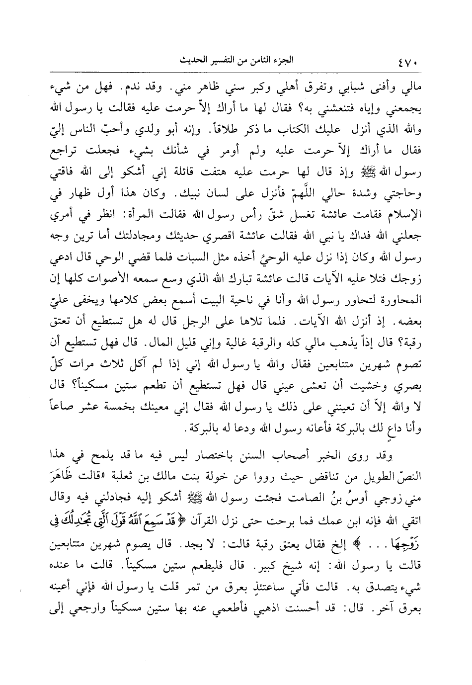 مالي وأفنى شبابي وتفرق أهلي وكبر سني ظاهر مني. وقد ندم. فهل من شيء يجمعني وإياه فتنعشني به؟ فقال لها ما أراك إلّا حرمت عليه فقالت يا رسول الله والله الذي أنزل عليك الكتاب ما ذكر طلاقا. وإنه أبو ولدي وأحبّ الناس إليّ فقال ما أراك إلّا حرمت عليه ولم أومر في شأنك بشيء فجعلت تراجع رسول الله صلى الله عليه وسلم وإذ قال لها حرمت عليه هتفت قائلة إني أشكو إلى الله فاقتي وحاجتي وشدة حالي اللهمّ فأنزل على لسان نبيك. وكان هذا أول ظهار في الإسلام فقامت عائشة تغسل شقّ رأس رسول الله فقالت المرأة: انظر في أمري جعلني الله فداك يا نبي الله فقالت عائشة اقصري حديثك ومجادلتك أما ترين وجه رسول الله وكان إذا نزل عليه الوحي أخذه مثل السبات فلما قضي الوحي قال ادعي زوجك فتلا عليه الآيات قالت عائشة تبارك الله الذي وسع سمعه الأصوات كلها إن المحاورة لتحاور رسول الله وأنا في ناحية البيت أسمع بعض كلامها ويخفى عليّ بعضه. إذ أنزل الله الآيات. فلما تلاها على الرجل قال له هل تستطيع أن تعتق رقبة؟ قال إذا يذهب مالي كله والرقبة غالية وإني قليل المال. قال فهل تستطيع أن تصوم شهرين متتابعين فقال والله يا رسول الله إني إذا لم آكل ثلاث مرات كلّ بصري وخشيت أن تعشى عيني قال فهل تستطيع أن تطعم ستين مسكينا؟ قال لا والله إلّا أن تعينني على ذلك يا رسول الله فقال إني معينك بخمسة عشر صاعا وأنا داع لك بالبركة فأعانه رسول الله ودعا له بالبركة.