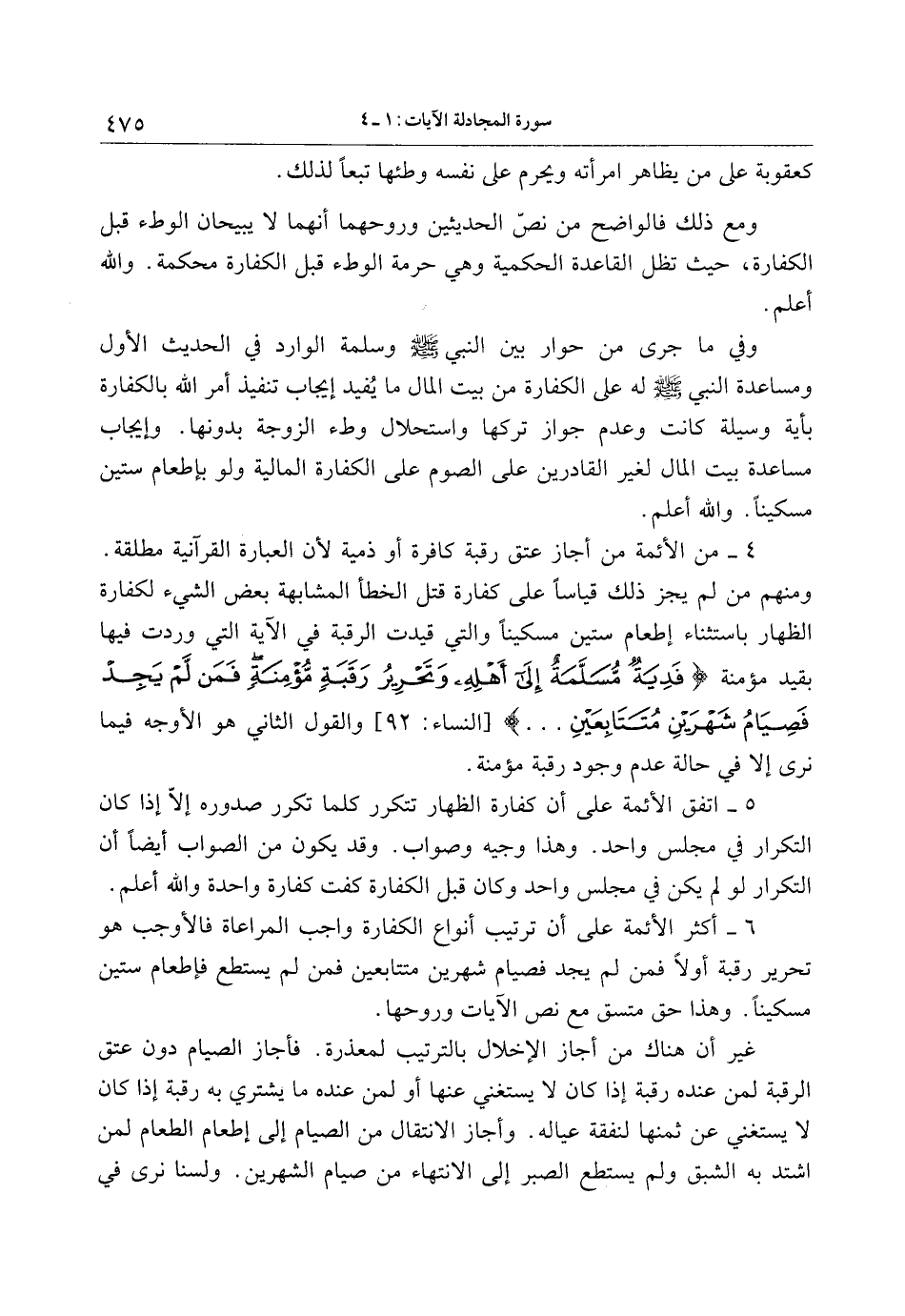 6- أكثر الأئمة على أن ترتيب أنواع الكفارة واجب المراعاة فالأوجب هو تحرير رقبة أولا فمن لم يجد فصيام شهرين متتابعين فمن لم يستطع فإطعام ستين مسكينا. وهذا حق متسق مع نص الآيات وروحها.