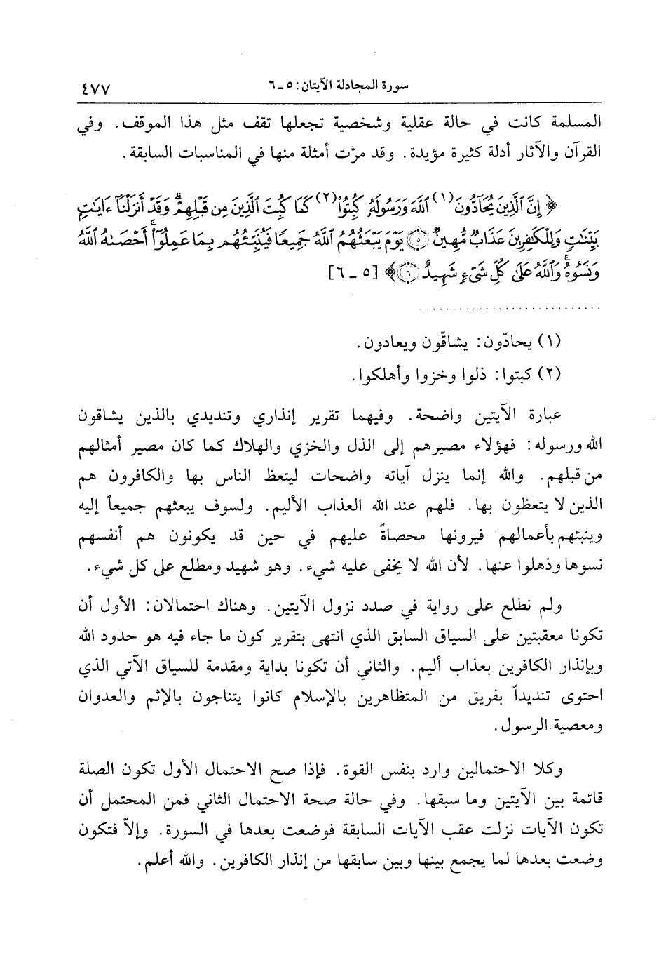 عبارة الآيتين واضحة. وفيهما تقرير إنذاري وتنديدي بالذين يشاقون الله ورسوله: فهؤلاء مصيرهم إلى الذل والخزي والهلاك كما كان مصير أمثالهم من قبلهم. والله إنما ينزل آياته واضحات ليتعظ الناس بها والكافرون هم الذين لا يتعظون بها. فلهم عند الله العذاب الأليم. ولسوف يبعثهم جميعا إليه وينبئهم بأعمالهم فيرونها محصاة عليهم في حين قد يكونون هم أنفسهم نسوها وذهلوا عنها. لأن الله لا يخفى عليه شيء. وهو شهيد ومطلع على كل شيء.