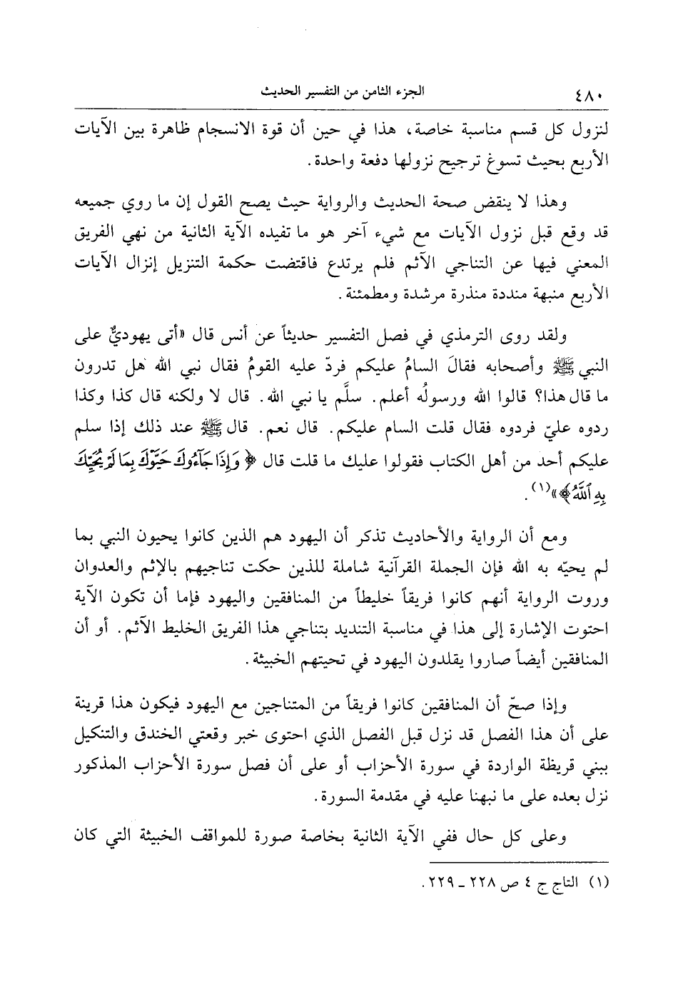 وإذا صحّ أن المنافقين كانوا فريقا من المتناجين مع اليهود فيكون هذا قرينة على أن هذا الفصل قد نزل قبل الفصل الذي احتوى خبر وقعتي الخندق والتنكيل ببني قريظة الواردة في سورة الأحزاب أو على أن فصل سورة الأحزاب المذكور نزل بعده على ما نبهنا عليه في مقدمة السورة.