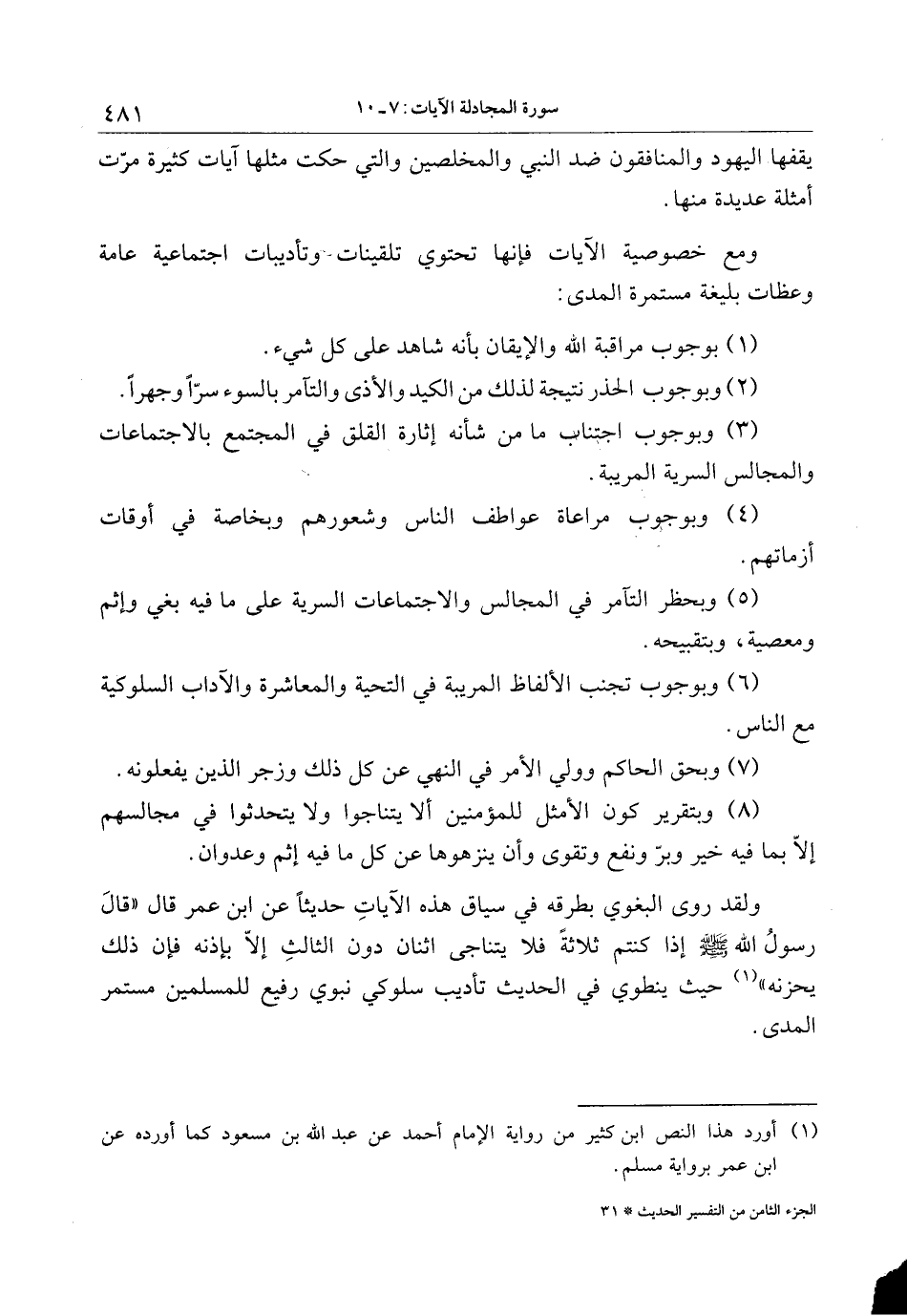 (8) وبتقرير كون الأمثل للمؤمنين ألا يتناجوا ولا يتحدثوا في مجالسهم إلّا بما فيه خير وبرّ ونفع وتقوى وأن ينزهوها عن كل ما فيه إثم وعدوان.