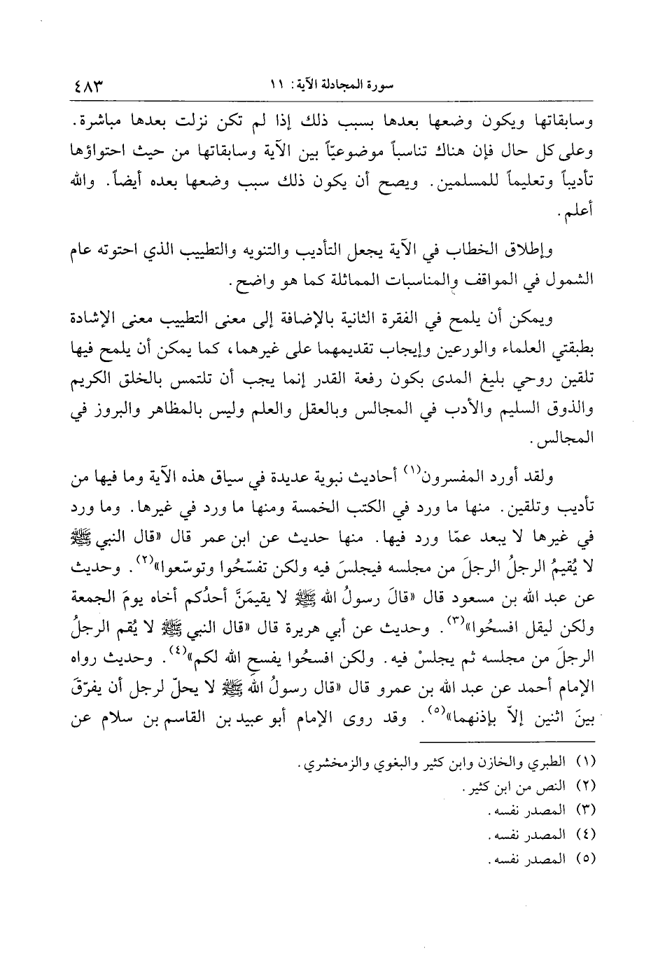ولقد أورد المفسرون «1» أحاديث نبوية عديدة في سياق هذه الآية وما فيها من تأديب وتلقين. منها ما ورد في الكتب الخمسة ومنها ما ورد في غيرها. وما ورد في غيرها لا يبعد عمّا ورد فيها. منها حديث عن ابن عمر قال «قال النبي صلى الله عليه وسلم لا يقيم الرجل الرجل من مجلسه فيجلس فيه ولكن تفسّحوا وتوسّعوا» «2» . وحديث عن عبد الله بن مسعود قال «قال رسول الله صلى الله عليه وسلم لا يقيمنّ أحدكم أخاه يوم الجمعة ولكن ليقل افسحوا» «3» . وحديث عن أبي هريرة قال «قال النبي صلى الله عليه وسلم لا يقم الرجل الرجل من مجلسه ثم يجلس فيه. ولكن افسحوا يفسح الله لكم» «4» . وحديث رواه الإمام أحمد عن عبد الله بن عمرو قال «قال رسول الله صلى الله عليه وسلم لا يحلّ لرجل أن يفرّق بين اثنين إلّا بإذنهما» «5» . وقد روى الإمام أبو عبيد بن القاسم بن سلام عن