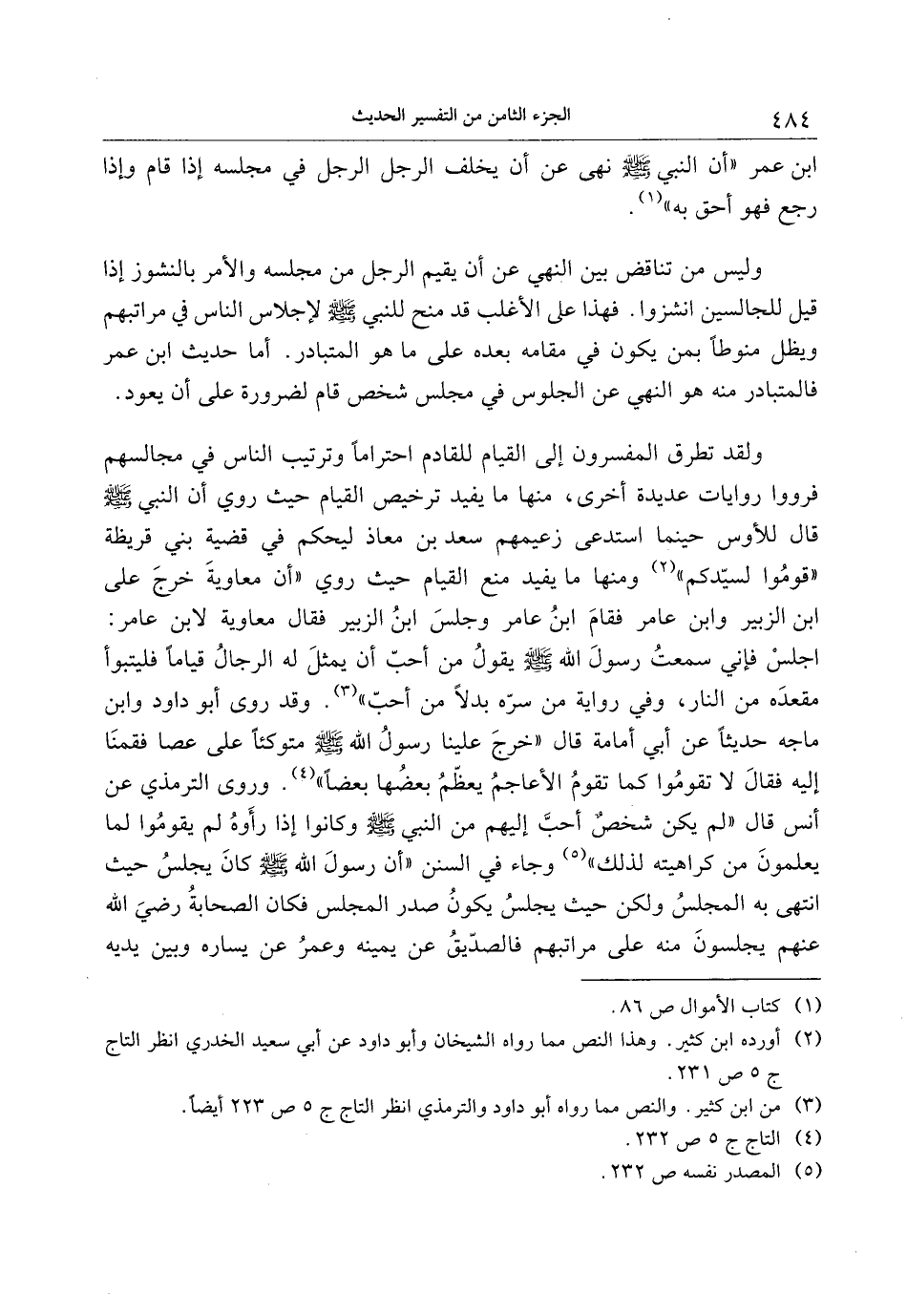 ولقد تطرق المفسرون إلى القيام للقادم احتراما وترتيب الناس في مجالسهم فرووا روايات عديدة أخرى، منها ما يفيد ترخيص القيام حيث روي أن النبي صلى الله عليه وسلم قال للأوس حينما استدعى زعيمهم سعد بن معاذ ليحكم في قضية بني قريظة «قوموا لسيّدكم» «2» ومنها ما يفيد منع القيام حيث روي «أن معاوية خرج على ابن الزبير وابن عامر فقام ابن عامر وجلس ابن الزبير فقال معاوية لابن عامر:
