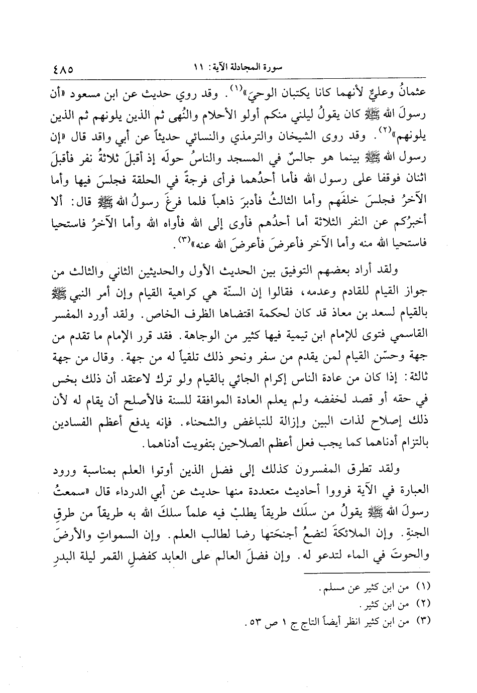 عثمان وعليّ لأنهما كانا يكتبان الوحي» «1» . وقد روي حديث عن ابن مسعود «أن رسول الله صلى الله عليه وسلم كان يقول ليلني منكم أولو الأحلام والنهى ثم الذين يلونهم ثم الذين يلونهم» «2» . وقد روى الشيخان والترمذي والنسائي حديثا عن أبي واقد قال «إن رسول الله صلى الله عليه وسلم بينما هو جالس في المسجد والناس حوله إذ أقبل ثلاثة نفر فأقبل اثنان فوقفا على رسول الله فأما أحدهما فرأى فرجة في الحلقة فجلس فيها وأما الآخر فجلس خلفهم وأما الثالث فأدبر ذاهبا فلما فرغ رسول الله صلى الله عليه وسلم قال: ألا أخبركم عن النفر الثلاثة أما أحدهم فأوى إلى الله فأواه الله وأما الآخر فاستحيا فاستحيا الله منه وأما الآخر فأعرض فأعرض الله عنه» «3» .
